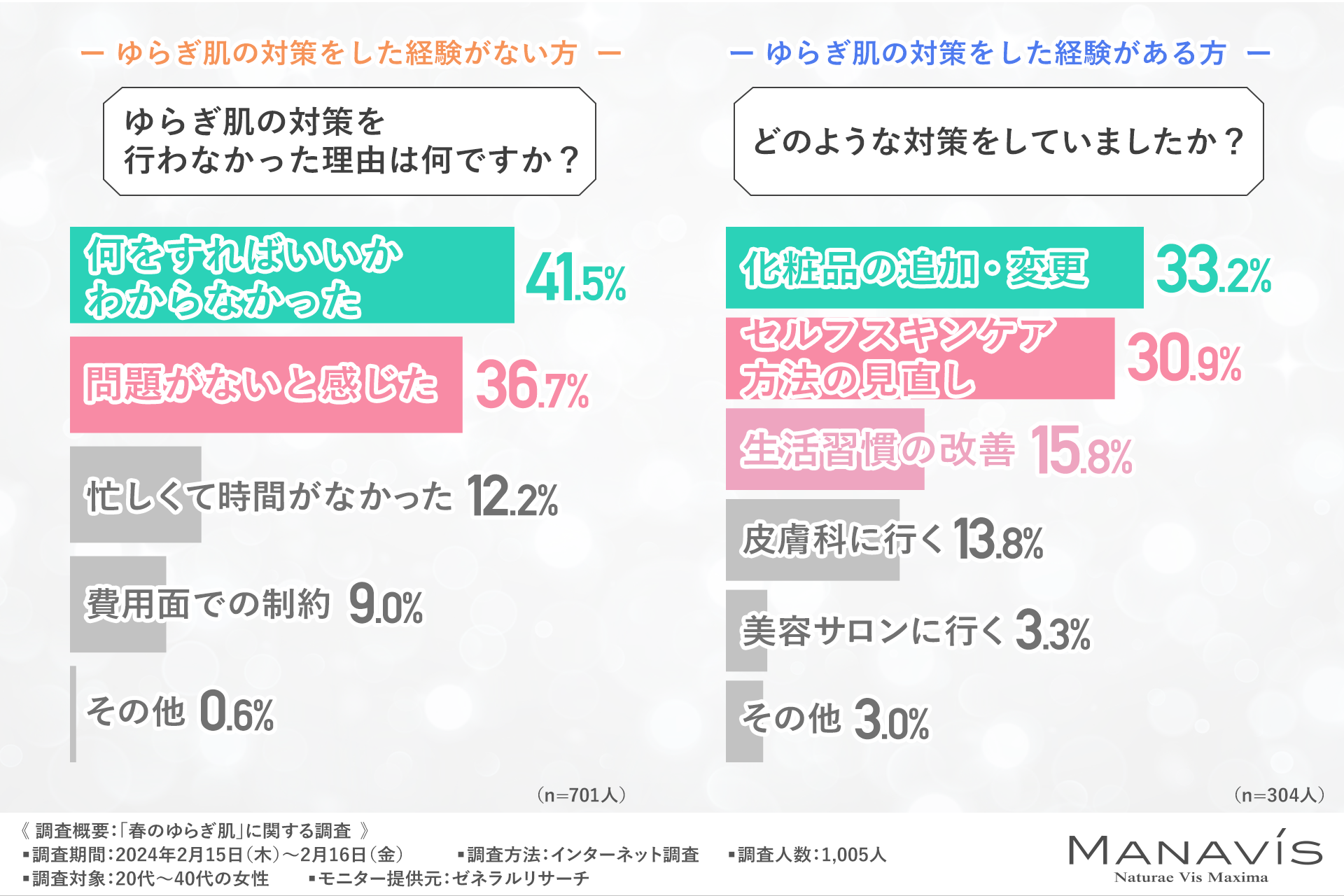 そこで、「ゆらぎ肌の対策を行わなかった理由は何ですか?」と質問したところ、『何をすればいいかわからなかった(41.5%)』と回答した方が最も多く、次いで『問題がないと感じた(36.7%)』と続きました。