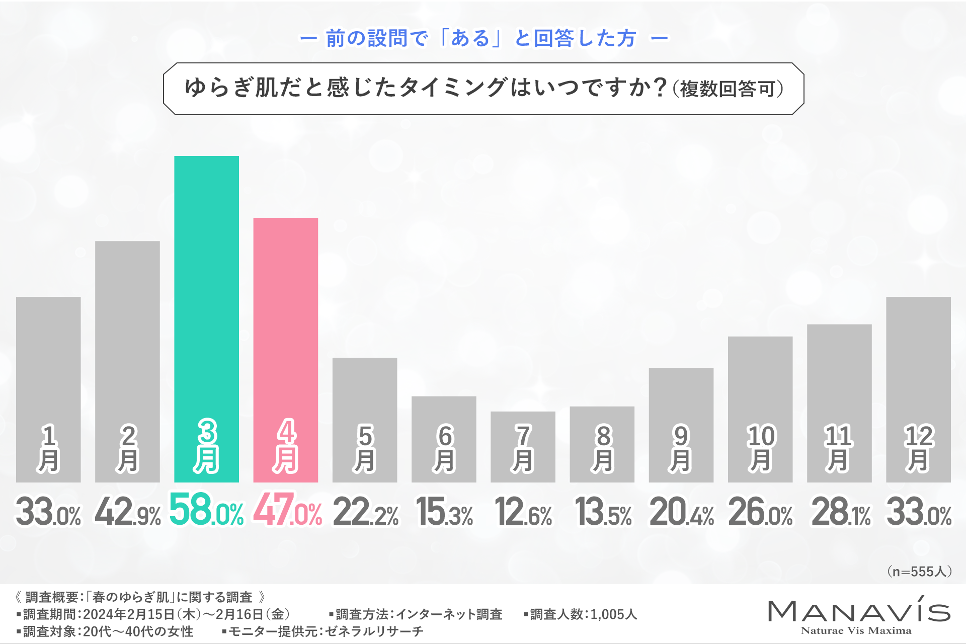 そこで「ある」と回答した方へ「ゆらぎ肌だと感じたタイミングはいつですか?(複数回答可) 」と質問したところ、『3月(58.0%)』と回答した方が最も多く、次いで『4月(47.0%)』と続きました。