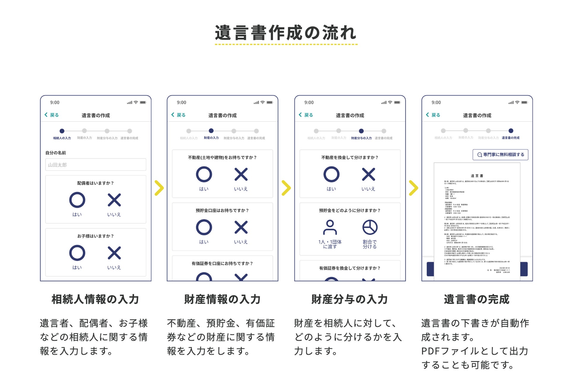 初心者でも簡単に利用できる「遺言書作成テンプレート」を提供します。1問1答式の質問に回答していくだけで、遺言書の下書きを作成することができます。遺言書に最低限書いておくべき内容が用意されており、「遺言書に何を書いて良いか分からない」という方でも簡単に書き始めることができます。一度作成した遺言書の下書きはクラウド上に保管してあるので、パソコンやスマホで何度でも書き直すことが可能です。さらに、法的な専門知識がなくても安心して使えるよう、法律の専門家による無料相談サービスも提供しています。