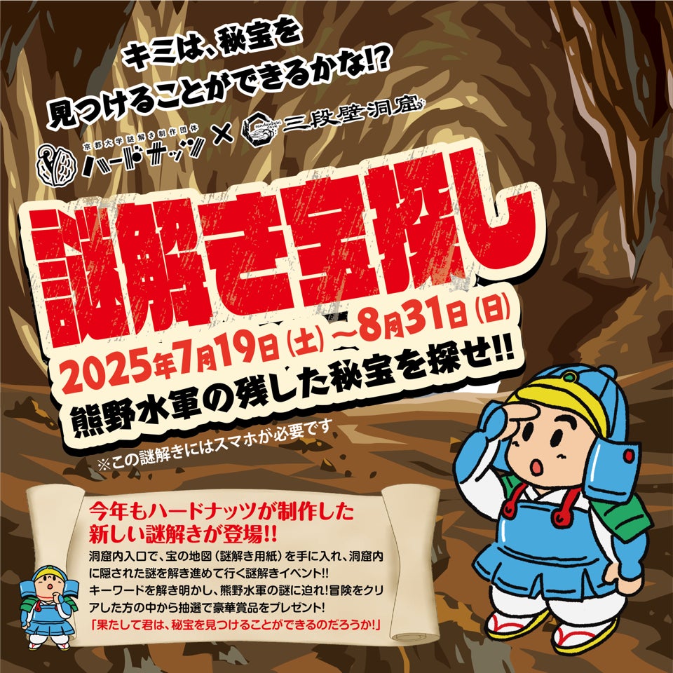 観光開発株式会社が運営する、三段壁洞窟(和歌山県白浜町)は、2025年7月19日(土)~2025年8月31日(日)の夏休み期間、「謎解き宝探し 熊野水軍の残した秘宝を探せ!!」を開催いたします。