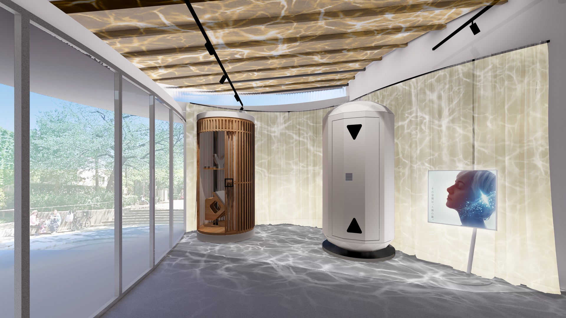 微かに流れる音楽と映像に身をまかせ、心地よい微睡みと覚醒の間で3.5次元のリラクゼーション空間へ誘います。疲労回復を目的としていた休息から、ココロや身体に加えて、感情から癒される空間を創り出します。