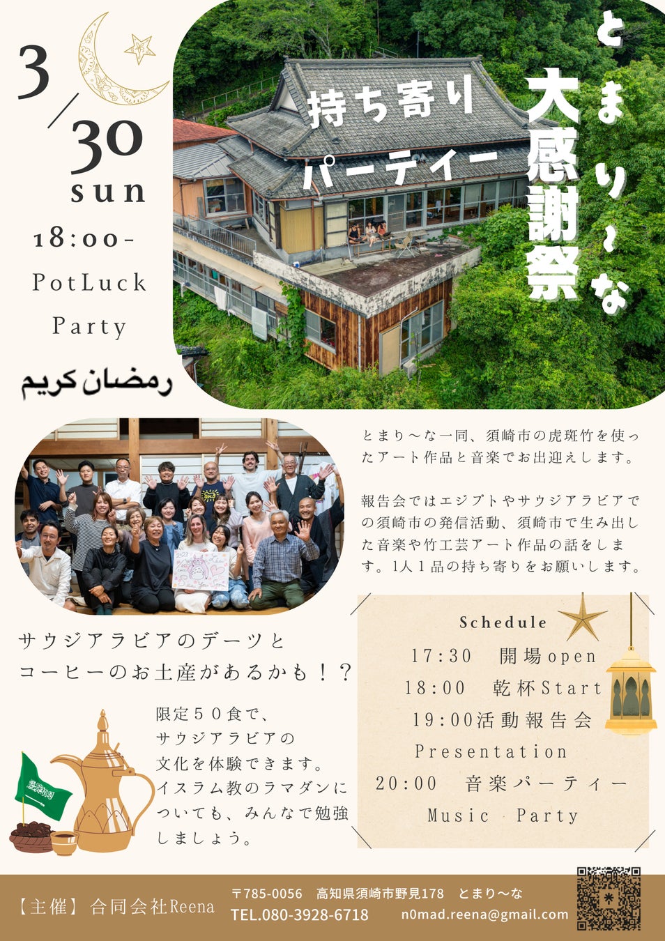 報告会ではエジプトやサウジアラビアでの須崎市の発信活動、須崎市で生み出した音楽や竹工芸アート作品の話をします。1人1品の持ち寄りをお願いします。