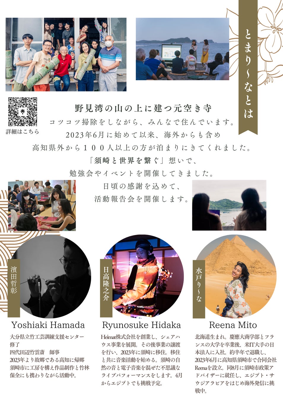 とまり〜なとは、自然を感じ、ビジネスを考え、音楽やアートを楽しむ、元空き寺の拠点です。コツコツ掃除をしながら、みんなで住んでいます。2023年6月に始めて以来、海外からも含め世界中を旅するノマドや、高知県外からも100人以上の方が泊まりにきてくれました。「須崎と世界を繋ぐ」想いで、