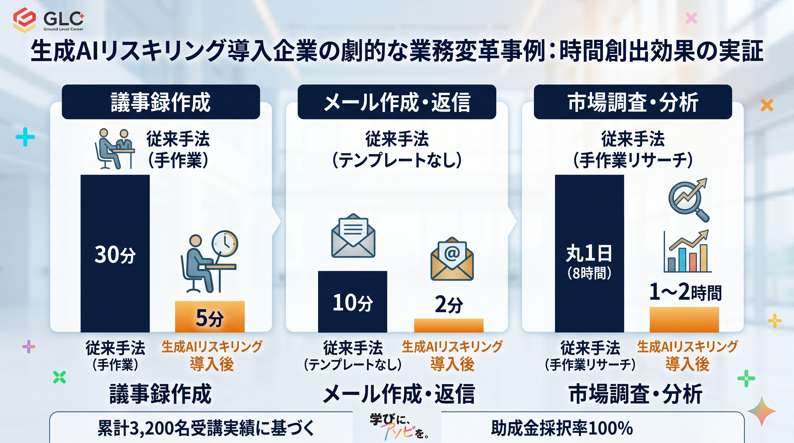 GLキャリアは完全独立のもと実績を公開。生成AIリスキリングは300社・3,200名が受講し、助成金採択率100%を維持。カスハラ対策AIも700社へ導入し、生産性向上と環境改善を強力に支援しています
