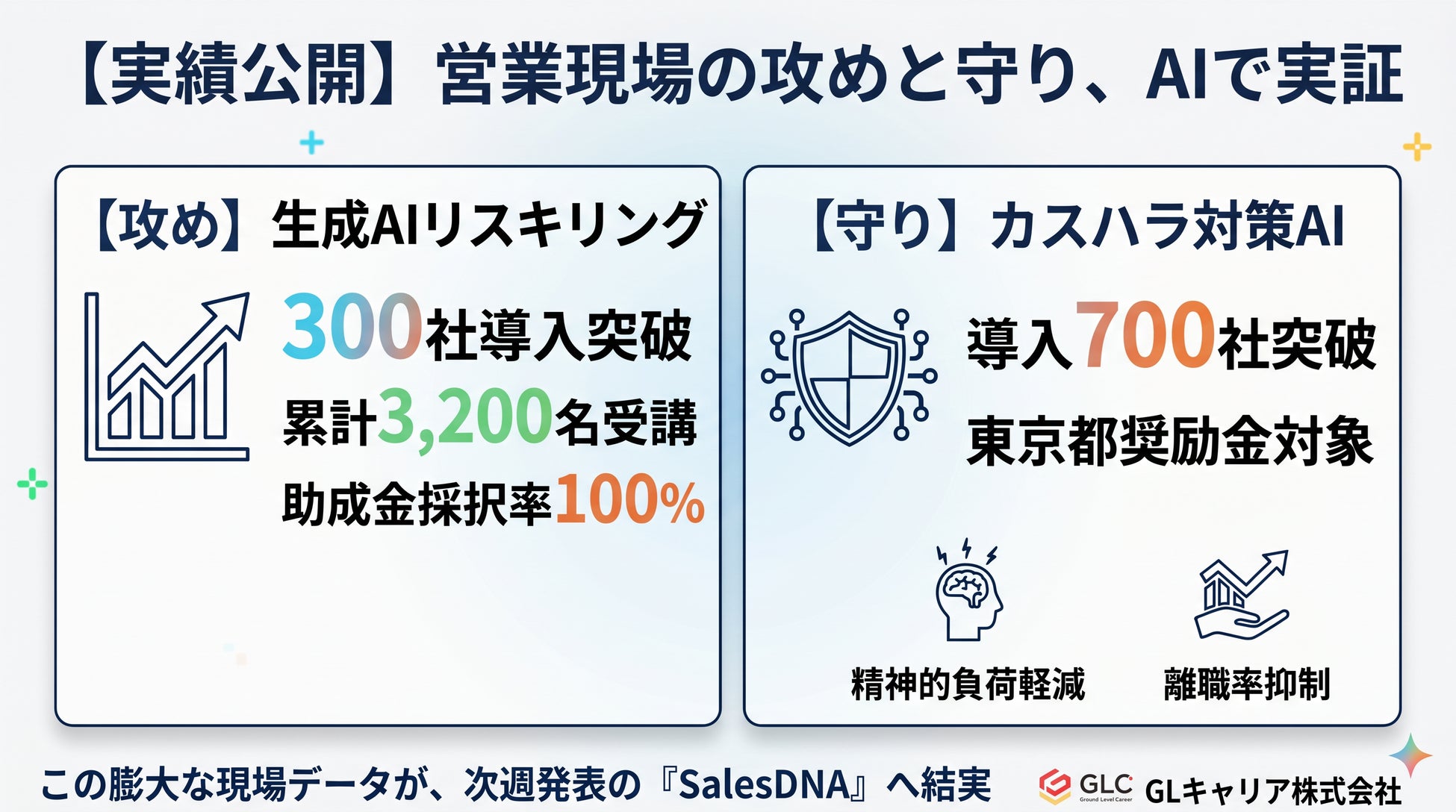 生成AI活用支援は導入300社・累計3,200名を突破し、助成金採択率100%を維持。また、深刻化するカスハラ対策においても、東京都の奨励金対象事業として700社への導入を達成し、多くの企業で現場の精神的負荷軽減と生産性向上を実現しております。これらの実績データは、営業組織の変革を加速させる次世代の営業DXプラットフォーム『SalesDNA』の礎となります。