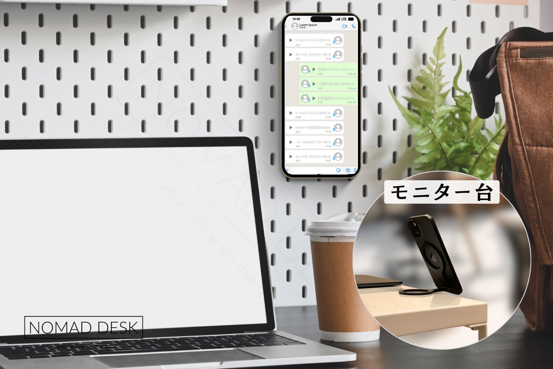 スチール製の有孔ボードやモニター台などにiPhoneを磁石で貼り付けて固定。メッセージやSNS、アプリのチェック