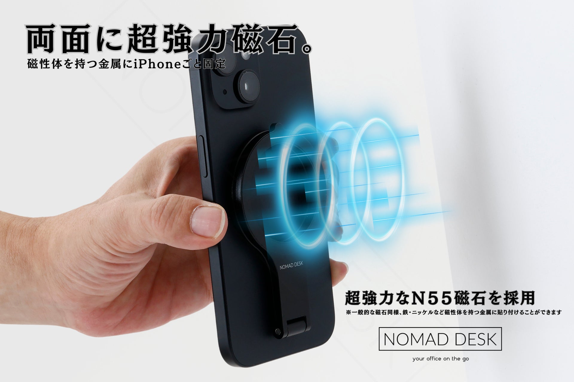 商品の両面には非常に強力なN55グレードのネオジム磁石を備えており、しっかりとiPhoneを固定(付属のメタルリングシールでMagSafe非対応スマホにも対応)