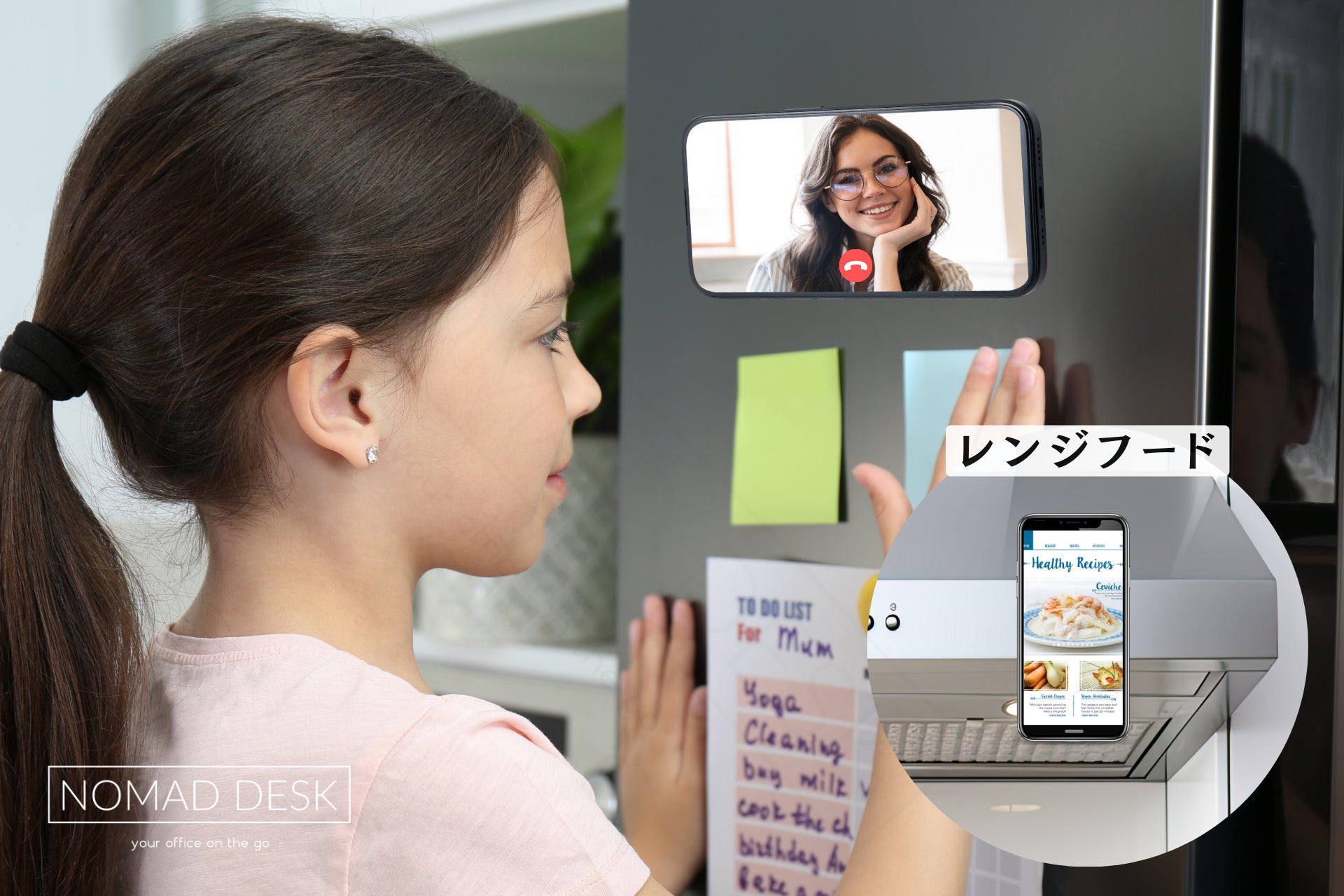 冷蔵庫に貼ってお子様とビデオ通話、キッチンタイマー。レンジフードに固定してレシピチェックなど