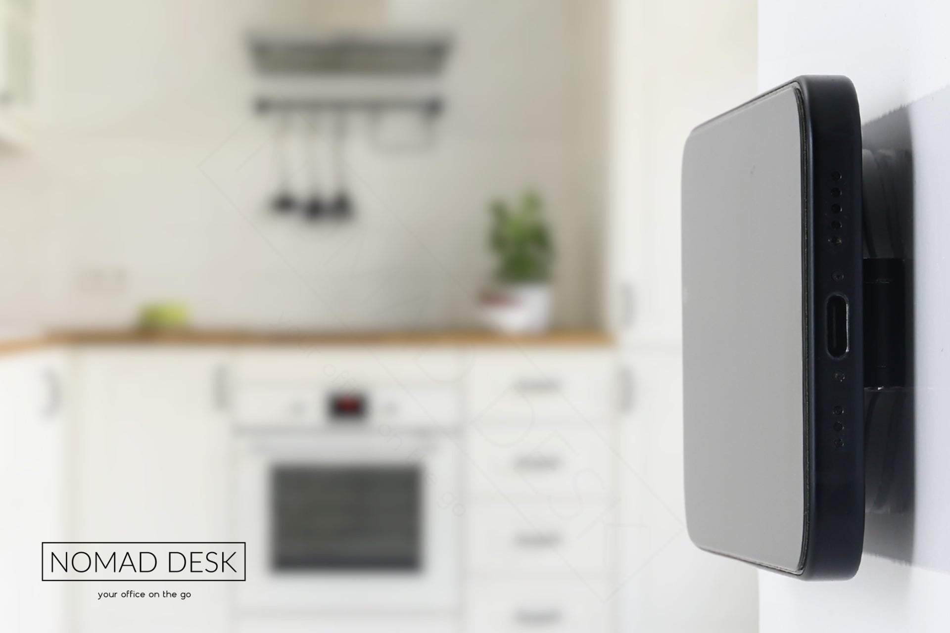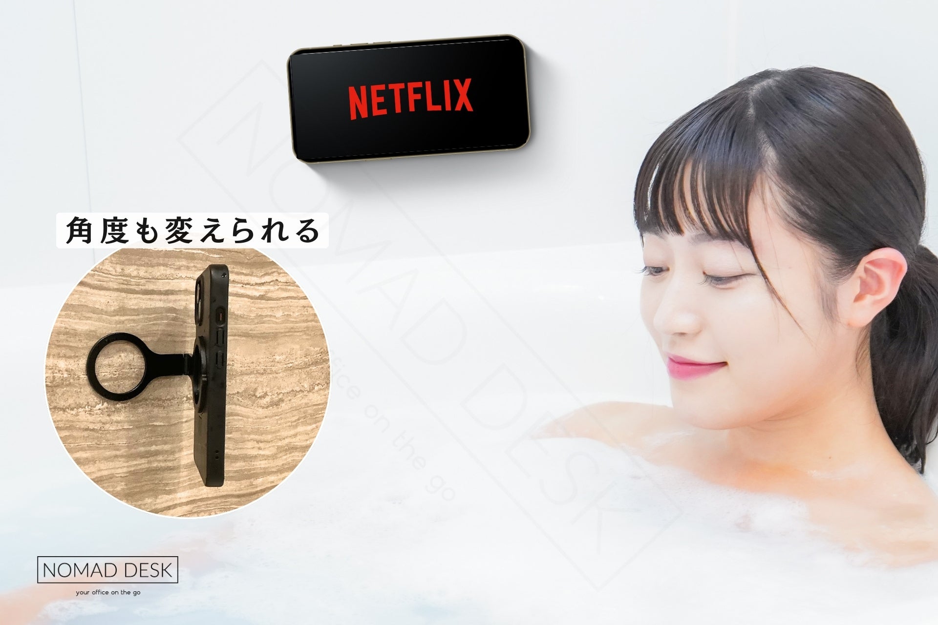 反対側の磁石で磁性体を持つ浴室の壁やホワイトボード、冷蔵庫などにiPhoneごと貼り付けてフリーハンズでご利用頂けます