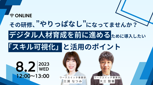 パーソルP&Tは、デジタル人材育成に取り組んでいる方や、研修実施後の効果測定に課題を感じている方を対象に、「スキル可視化」を取り入れるポイントや活用方法、“研修の成果”や“学習者の行動変容”に繋がる育成施策を考えるためのヒントをお伝えするセミナーを8月2日(水)12:00~13:00に開催します。