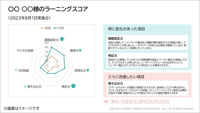 本サービスは、研修プログラムの受講前と受講後にデジタルスキルだけでなく変革スキルを重点にチェックし、ラーニングスコアとして可視化、“学んだことを現場でどの程度実践できているか”を測定します。その診断結果をもとに当社コンサルタントが人材育成担当者に対して次の施策(学習コンテンツや実践機会の設計、学習者メンタリングなど)をアドバイスすることで、企業のDX推進を実現します。