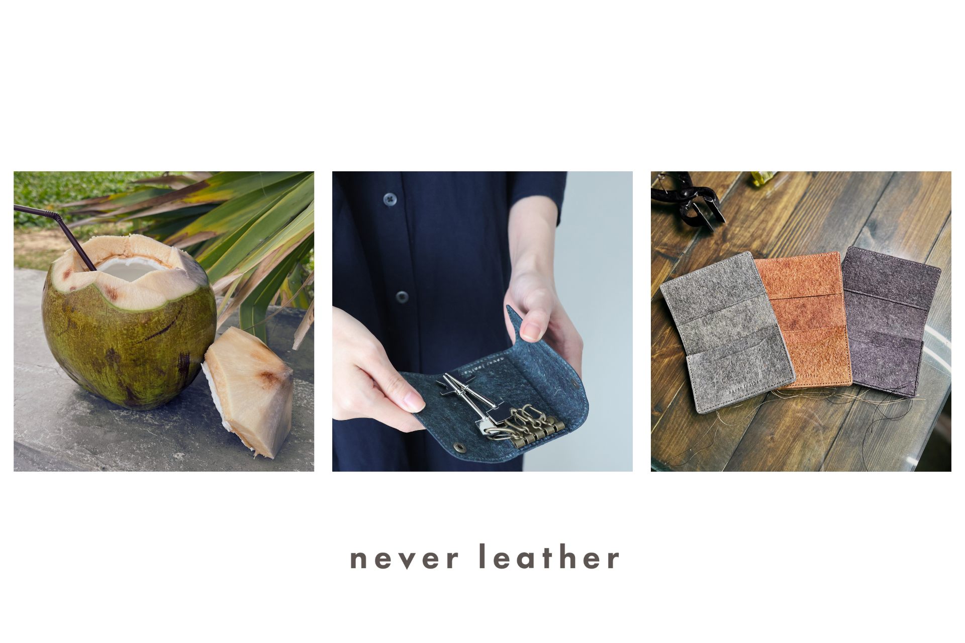 ココナッツレザーの新ブランド名は「never leather(ネバーレザー)」。 never には私たちのアイテムが「ずっとこのままの状態ではない」という forever へのアンチテーゼと循環の意味を込めました。