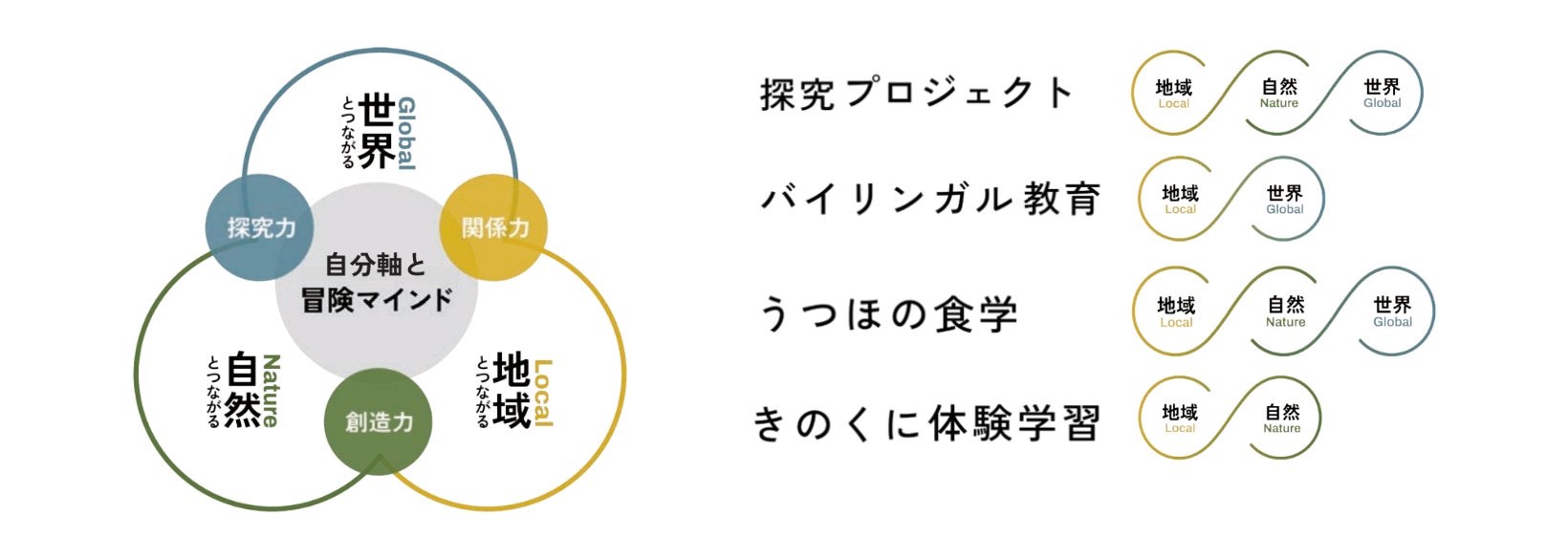 同学園が目指す探究型グローカル教育では、世界と地域、自然とつながる中で出された教科横断的なプロジェクトを中心にした「自分軸での学び」を大切にします。うつほの杜学園は「自分軸での学び」を大切に、「関係力」「探究力」「創造力」を育んでいきます。