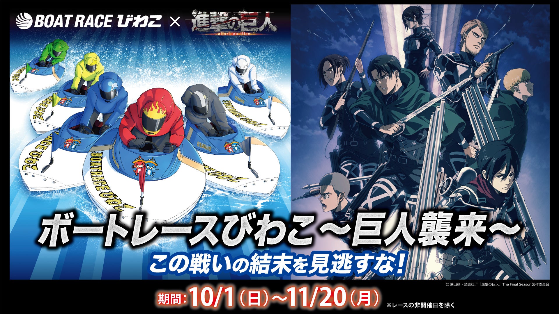 『進撃の巨人』は2013年からアニメ化され、日本のみならず世界中でも人気を集める作品となっており、11月4日(土)に放送となる「進撃の巨人The Final Season 完結編(後編)」に合わせて、ボートレースびわこにて同アニメとコラボレーションイベントを実施します。