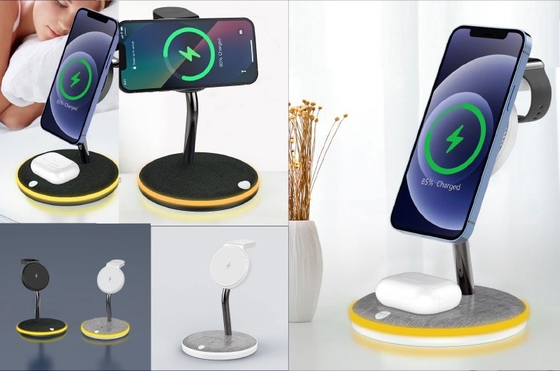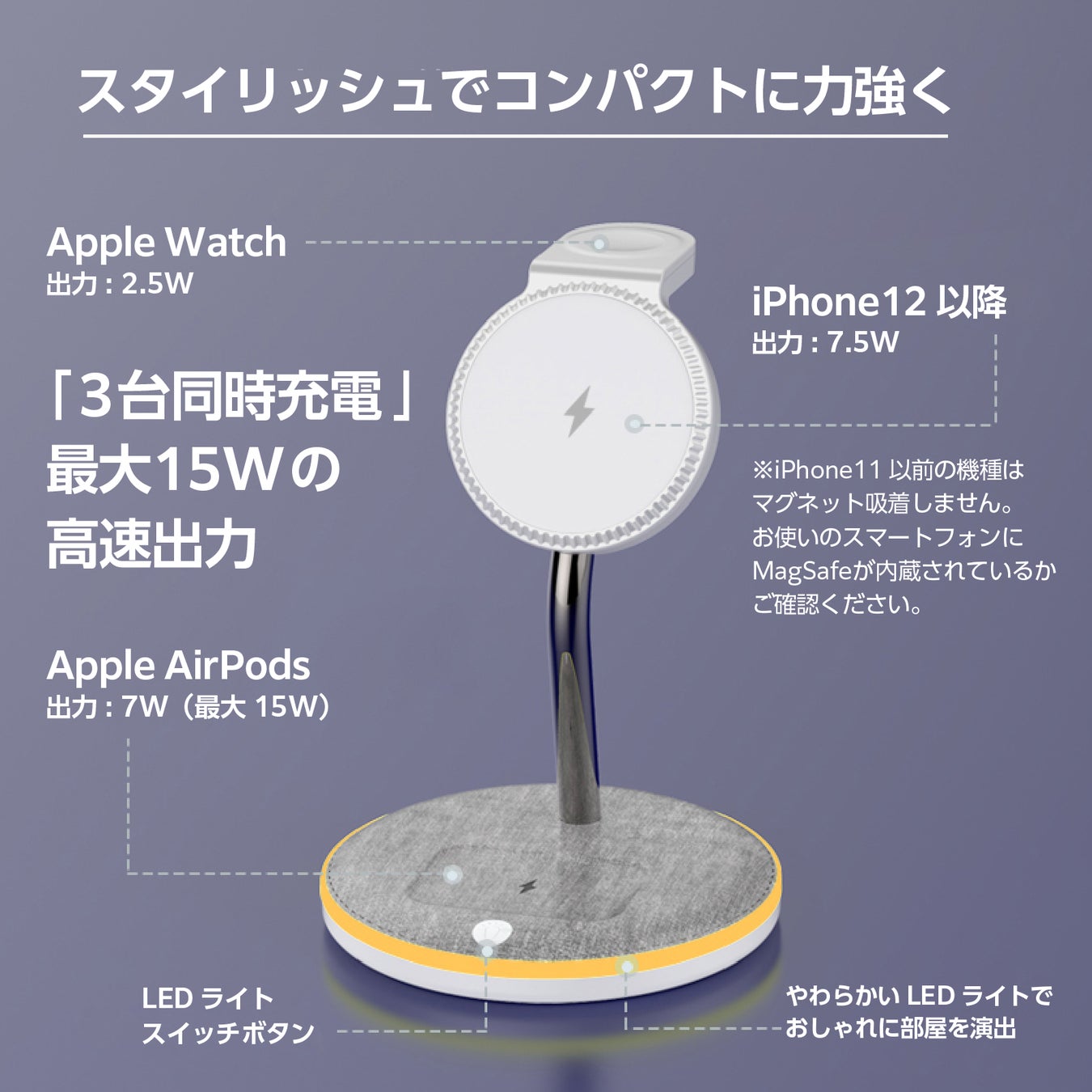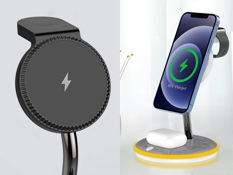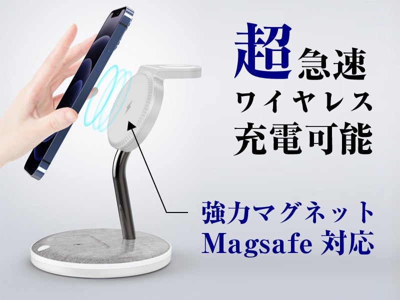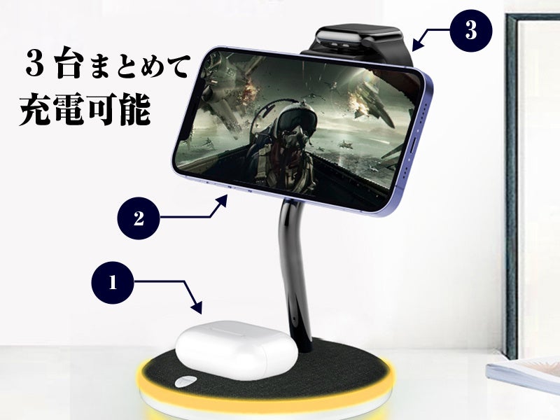 軽量コンパクトで唯一無二のデザインが、あなたの"デスク周りを変える"。スマホ、AppleWatch、AirPodsを三台同時に「まとめて充電」!