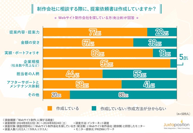 Webサイト制作会社に相談する際、自社の要望に沿った提案や価格を提示してほしいと考える多くの企業が、提案依頼書を用意することで要望を正しく伝え、自社への理解を深めてもらおうとしていることがわかります。
