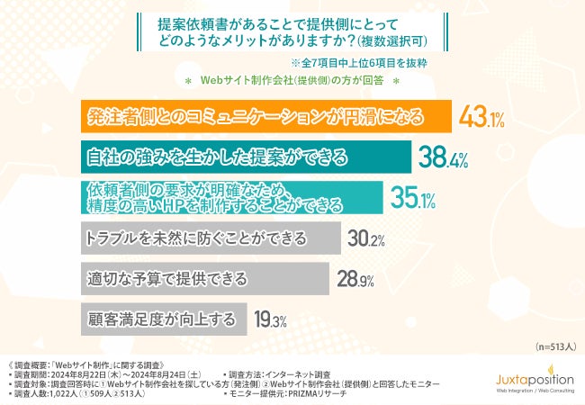 また、提案依頼書があることによって依頼者の要望が把握でき、高品質なWebサイトを制作できることやトラブルを未然に防ぐことができる点も、多くの方がメリットであると考えているようです。