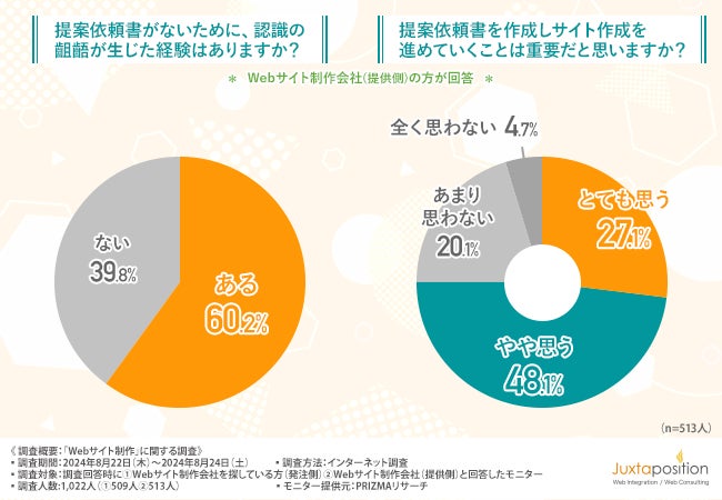 実際に、制作会社側の7割以上の方がサイト制作を進めていく上で提案依頼書は重要であると回答しており、提案依頼書がないために認識の齟齬が生じた経験がある方は6割以上にのぼる結果となりました。