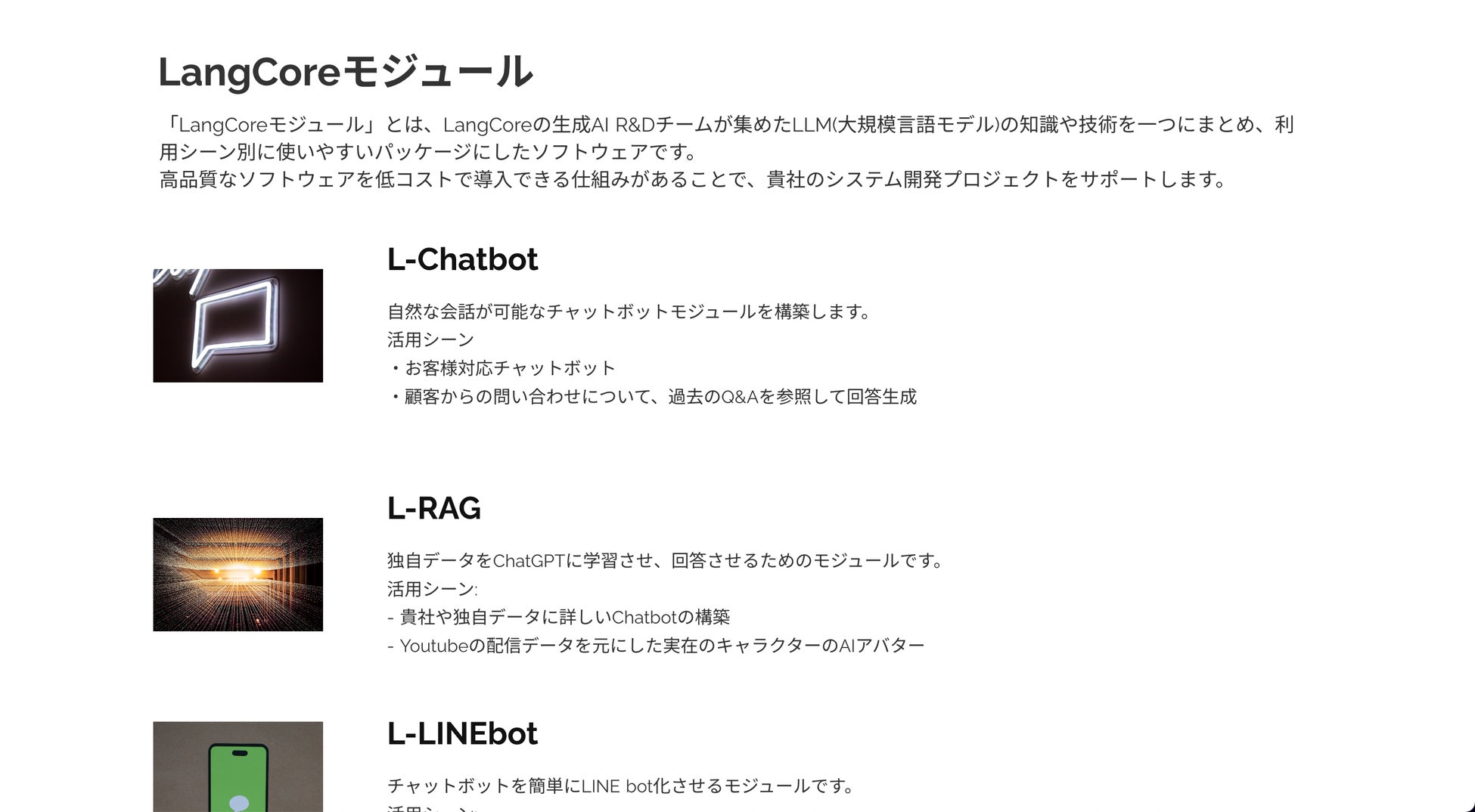 株式会社LangCoreは生成AIを活用したノウハウ・技術・システム開発リソースの提供を行う会社です。