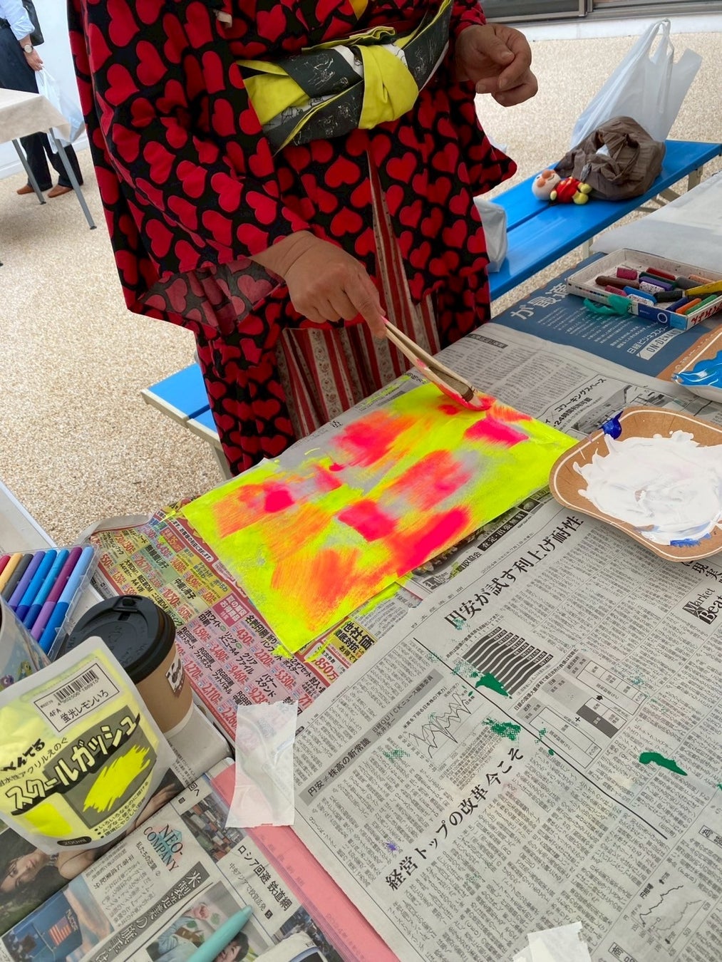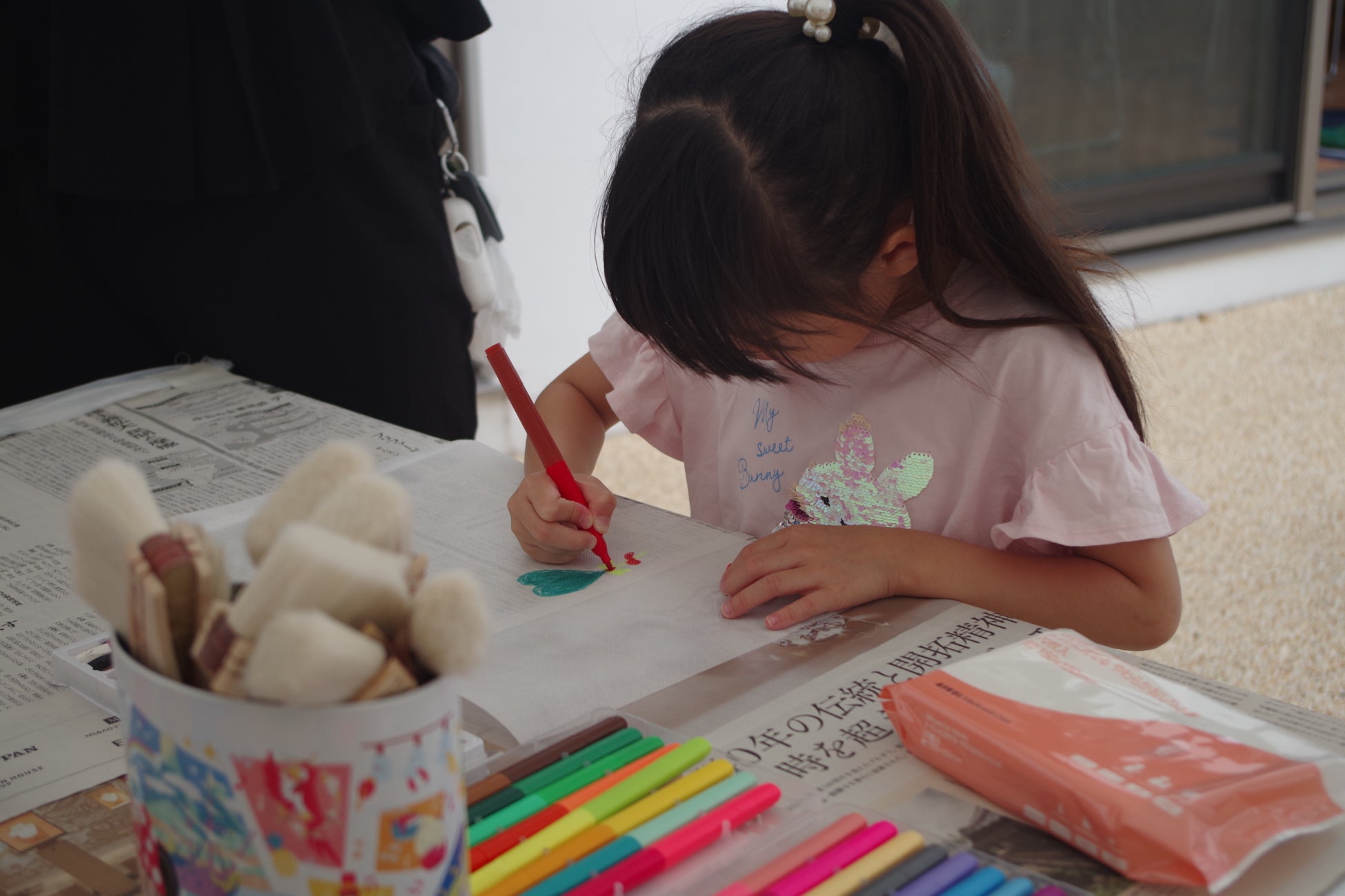 特に、カラフル西東京の施設上の特長である「中庭」では、フラッグペイントのワークショップが行われ、参加者は色鉛筆やアクリル絵の具、油性ペンなどを使い自由に創作。皆にこやかに、思い思いにアートに親しむ姿が印象的だった。