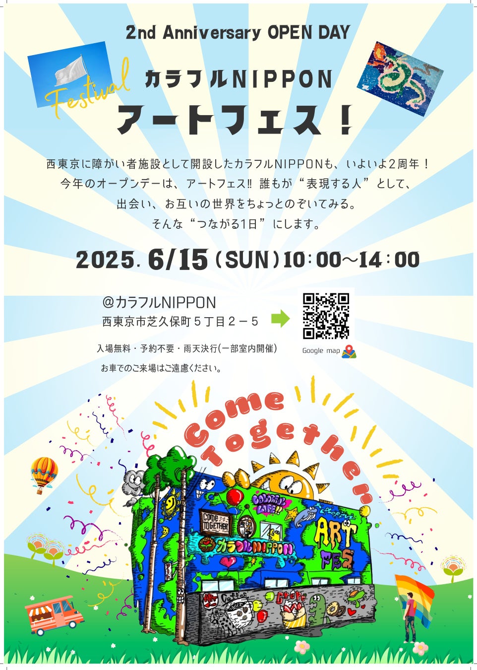 一般社団法人カラフルNIPPONは2025年6月15日、主に自閉スペクトラム症・行動障害を対象とした生活介護および共同生活援助(グループホーム)施設「カラフル西東京(東京都西東京市芝久保町五丁目2番5号)」の創設2周年を記念し「カラフル・アートフェス」と題したアートイベントを開催した。