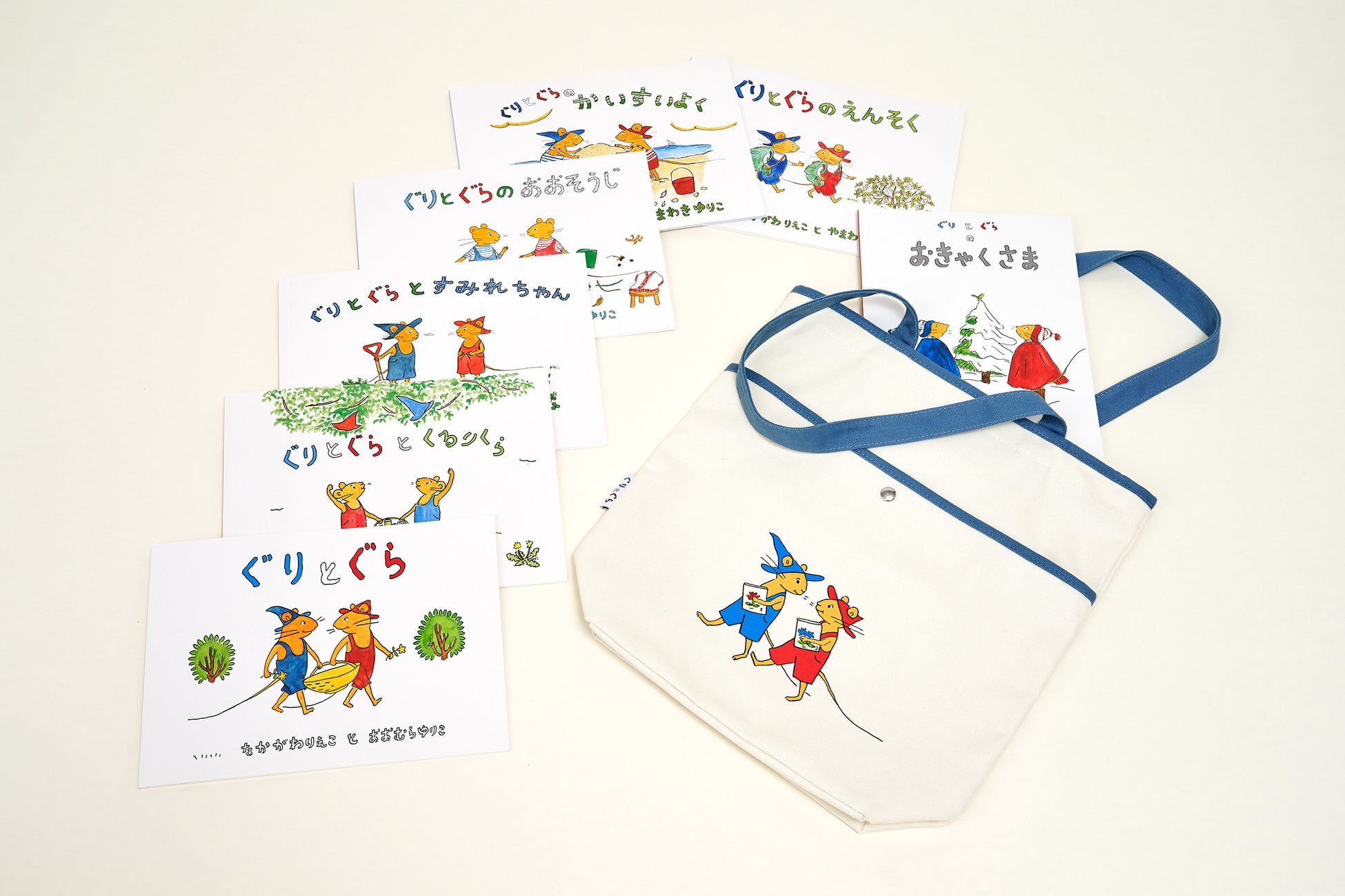 新発売する『ぐりとぐらの絵本 コットンバッグ付き7冊セット』は、『ぐりとぐら』はもちろん、『ぐりとぐらのおきゃくさま』『ぐりとぐらのかいすいよく』など一連のシリーズ作品を、内容はそのままにソフトカバー化し、オリジナルのコットンバッグとセットにした限定商品です。