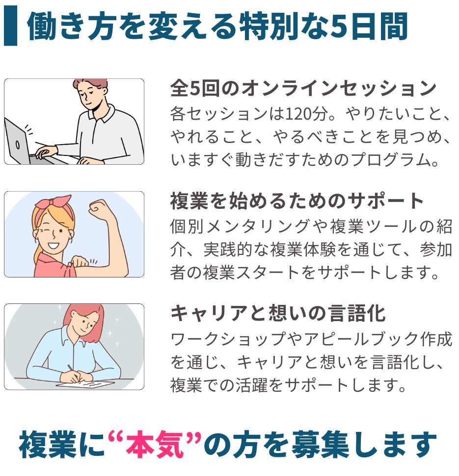 実践的なワークショップ、リアルな経験シェア、さまざまな複業スタイルの可能性などについてお伝えします。