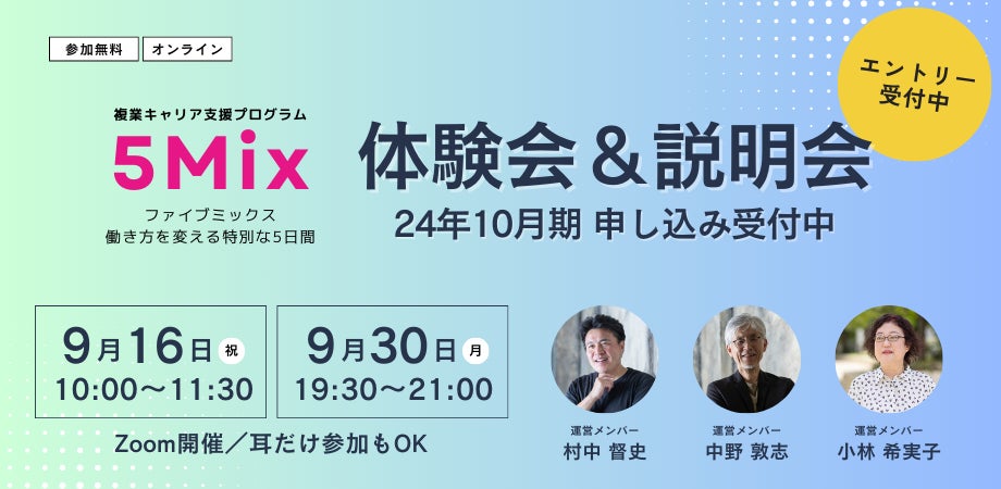 株式会社オモシゴ(本社:大阪府大阪市、代表取締役:村中督史)は、複業キャリア支援プログラム「5Mix」の2024年10月期参加者の募集を開始しました。あわせて、プログラムを体験できる無料説明会を開催いたします。