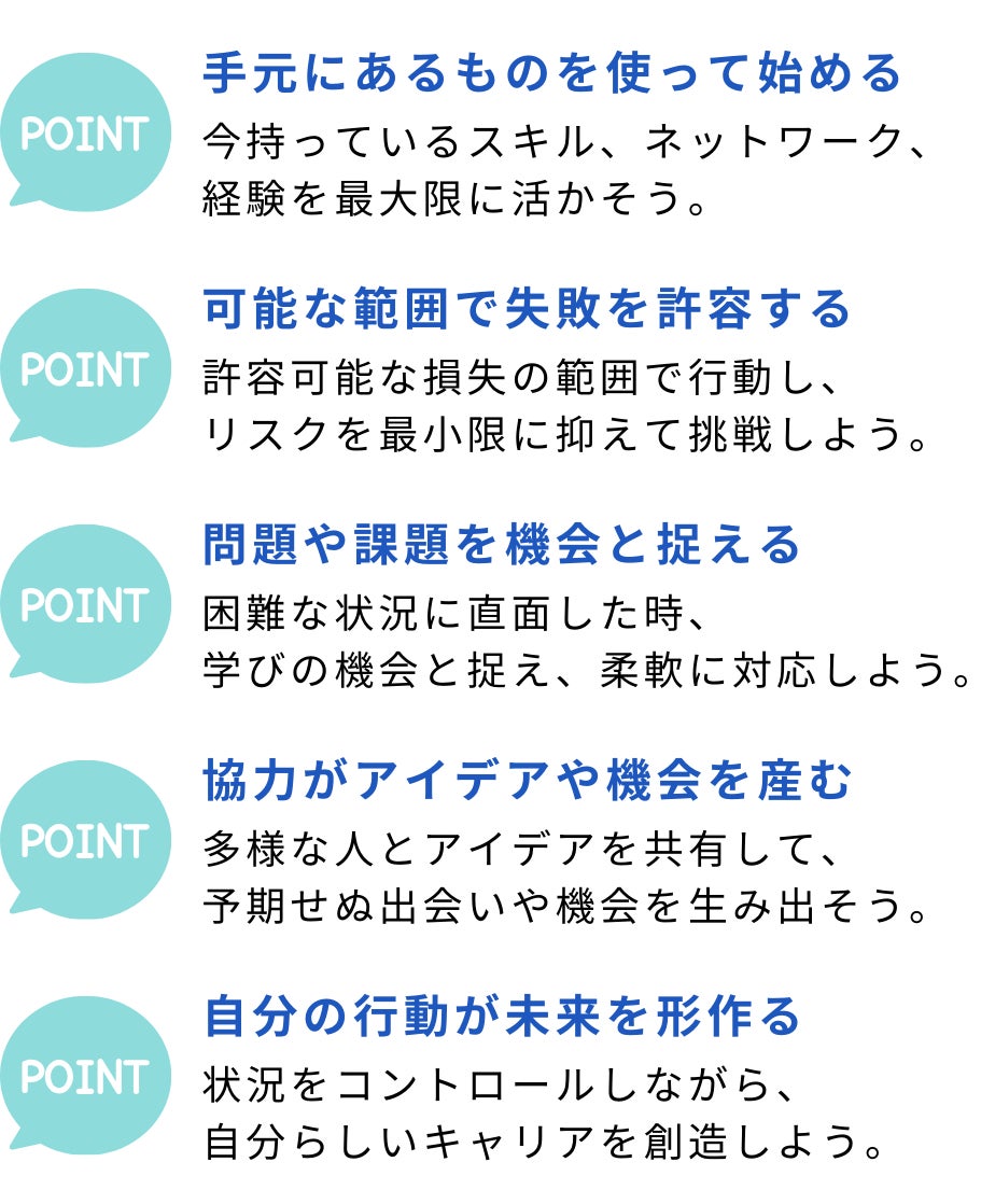 不確実性の高い状況で効果的な意思決定を行うための思考法です。従来の目標設定型アプローチとは異なり、手持ちの資源から出発し、柔軟に行動しながら新たな価値を創造していく方法です。