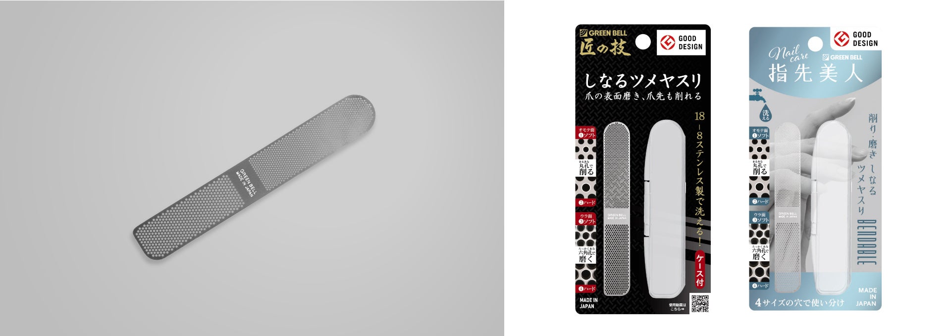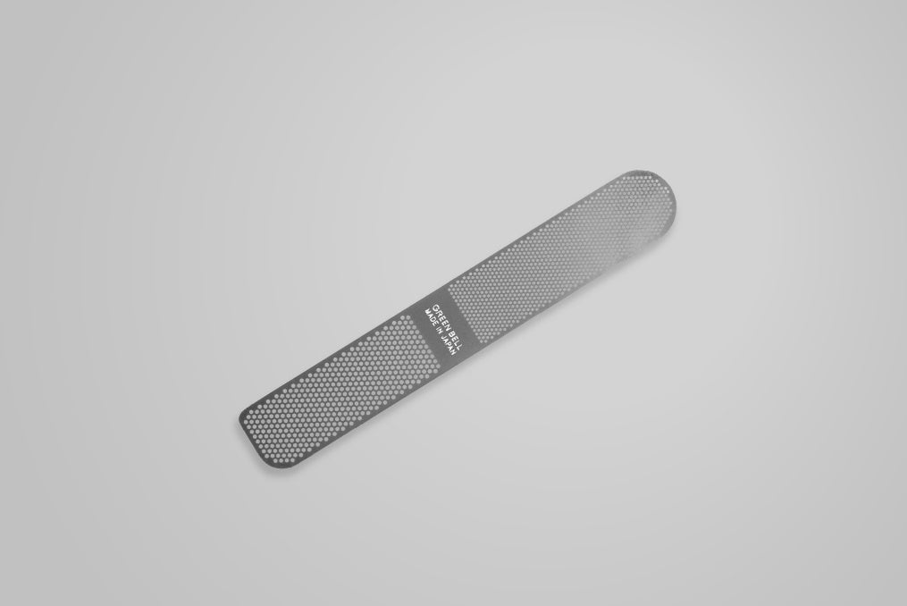 ネイルケアアイテムの一つである爪やすりには一般的に紙製、ガラス製、そして金属製のものがある。金属製の爪やすりは、一般的にしっかりとした厚みがあり目立ての加工がダイレクトにそのヤスリの効果に表れるものが多い。そんな中、0.5mm厚18-8ステンレス鋼を用いることで長寿命性、しなりによる指先への馴染み、またエッチングによる貫通孔で研削するという新たな可能性を導いている。実際に使用してみると爪先表面に沿う柔らかな当たりは紙製のやすりのような自由度があり、また細かな部分の削りに向いていることが分かる。製品の特長である六角目の研削力に驚き、金属製と紙製の良いとこ取りのように感じられた。目詰まりなく衛生的に使用し続けられる点も好感が持てた。