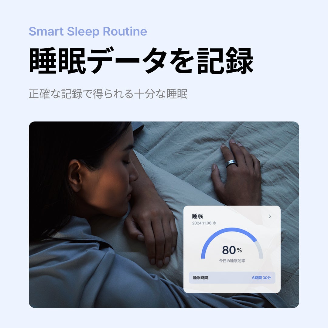 「b.ring」は、詳細な睡眠パターン分析を通じて、ユーザーがより深く回復力のある睡眠を取れるようサポートします。リング内に搭載された高精度センサーが、睡眠時間、睡眠ステージ、心拍数、血中酸素飽和度などをリアルタイムでモニタリングし、ユーザーの睡眠習慣や質の向上を支援します。