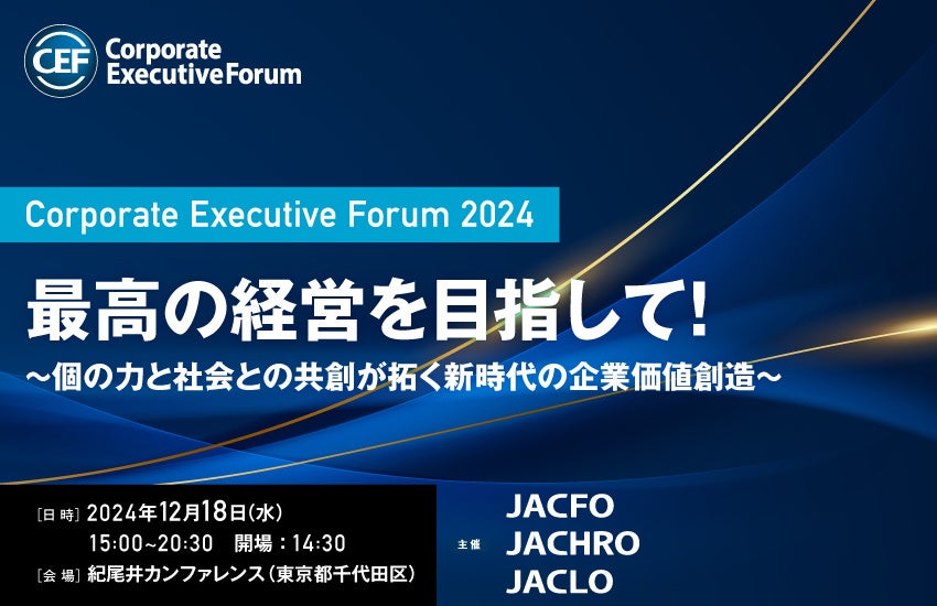 日本CFO協会、日本CHRO協会、日本CLO協会の3団体が主体となり、コーポレート横断的に今後の経営課題を見つめ、改革に向けた手がかりを見つけていただく対面イベント「Corporate Executive Forum 2024」(紀尾井カンファレンス)を12⽉18⽇(水)に開催いたします。