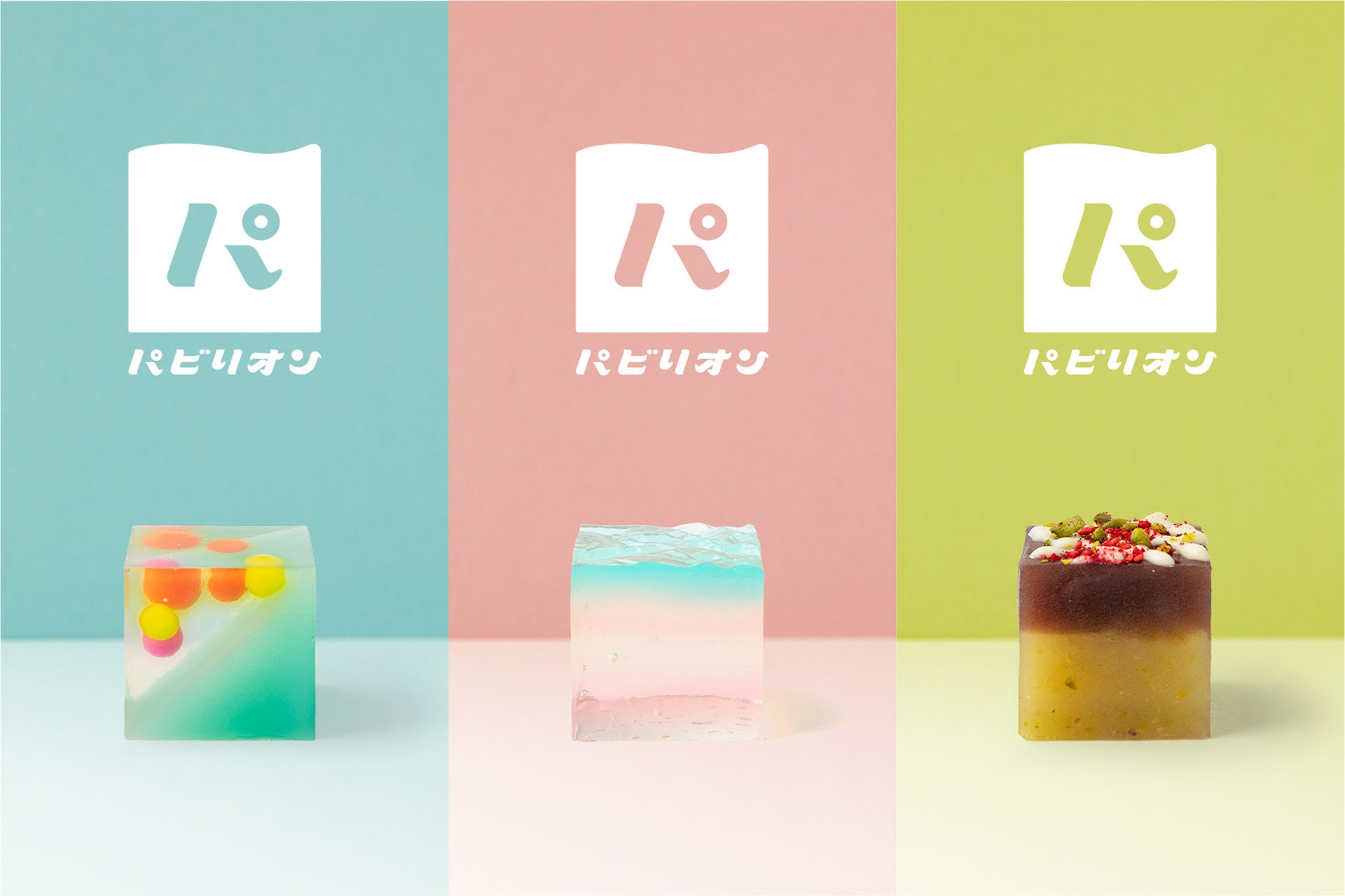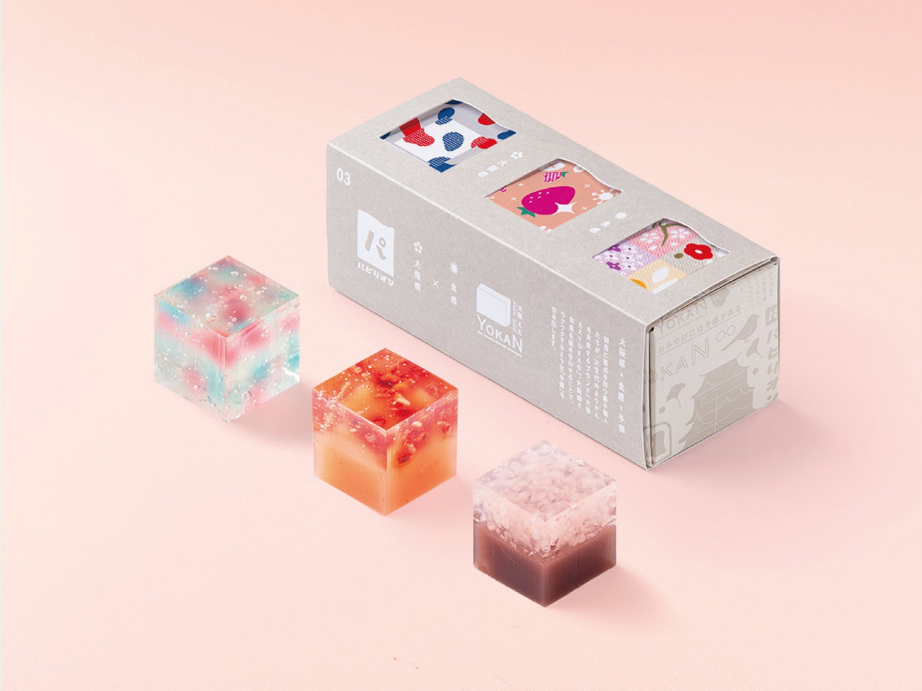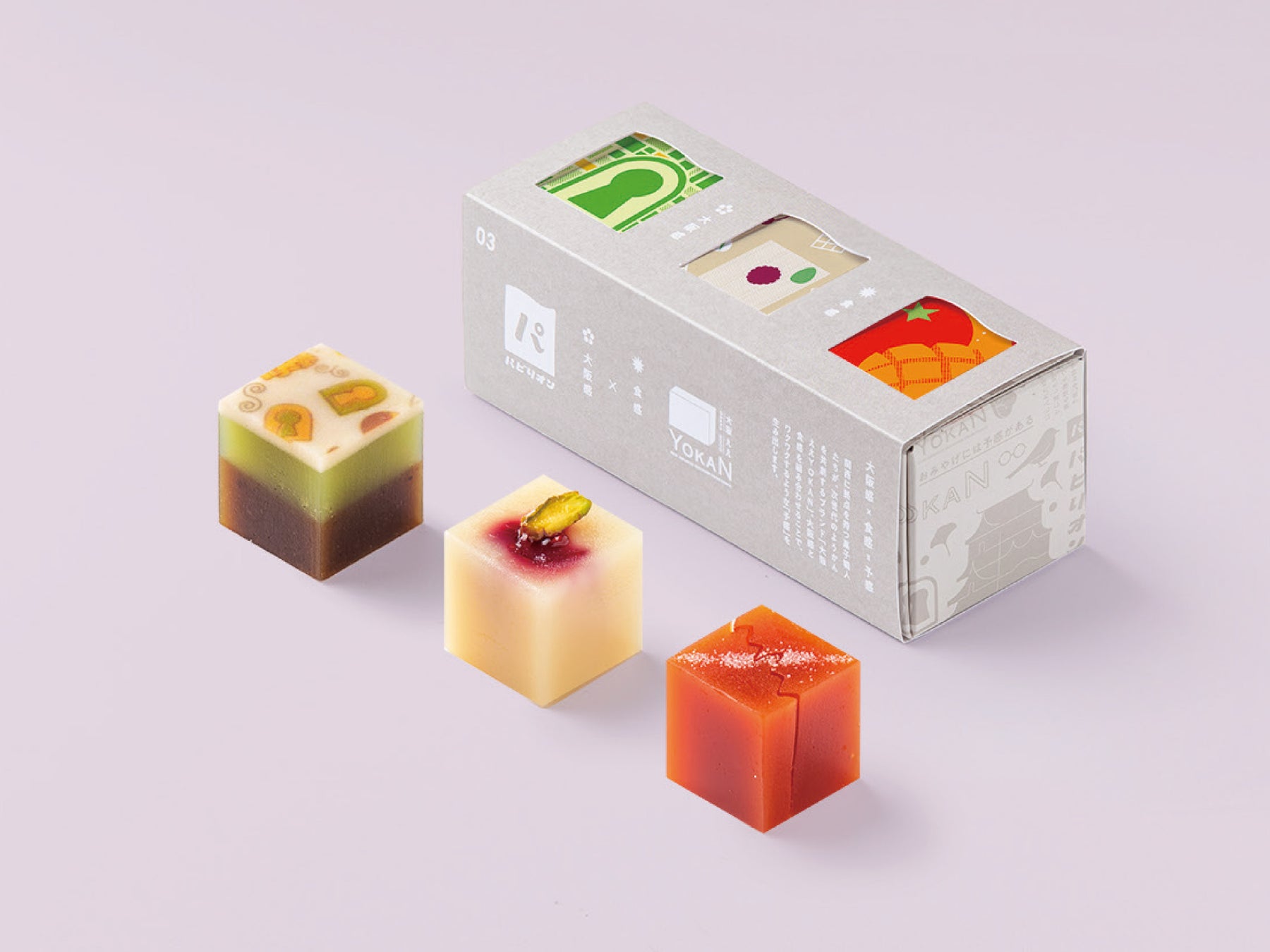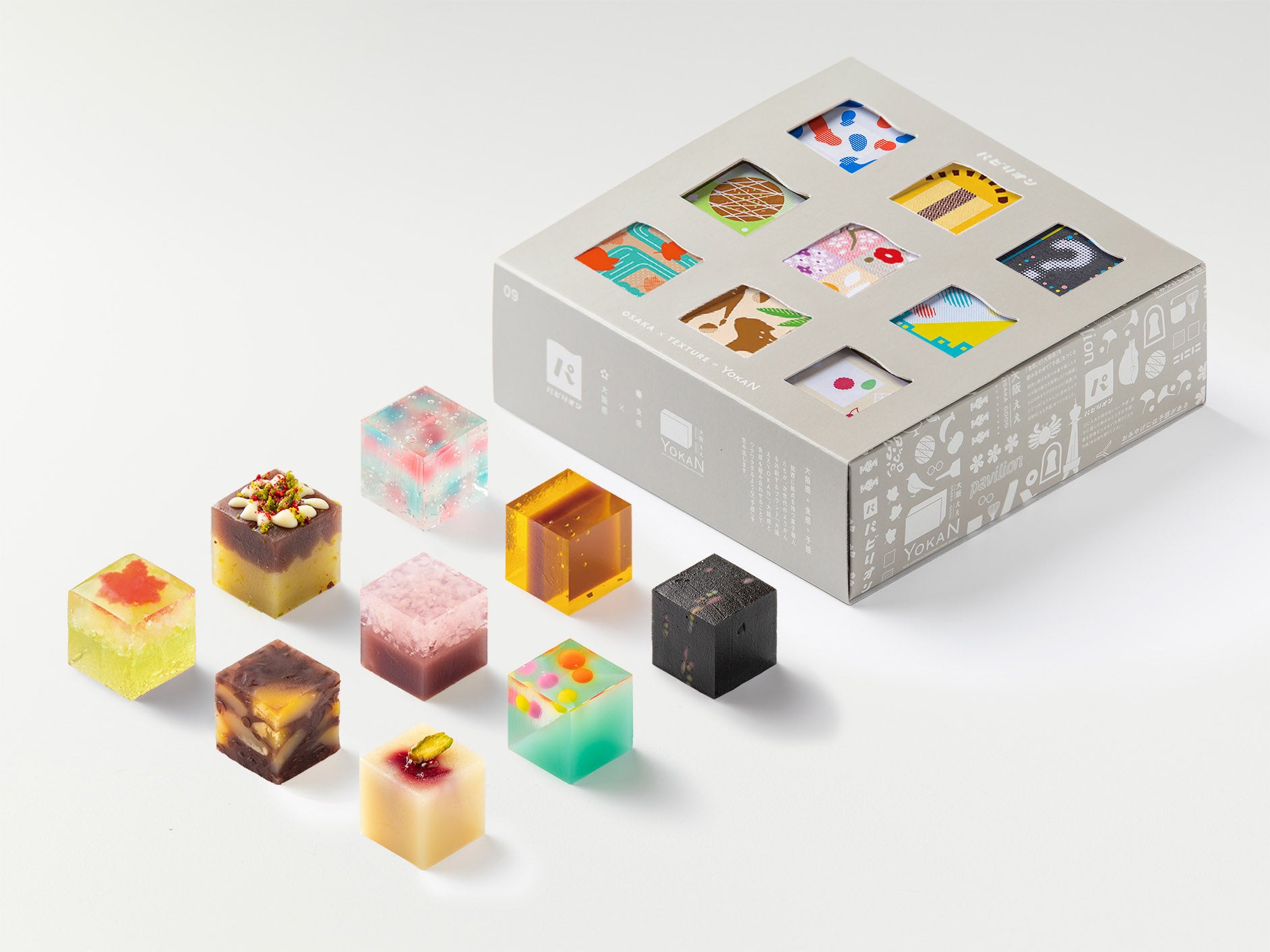 大阪の魅力を表現しながら、菓子職人としての技術を見せ合う様を万博内の「パビリオン」に見立てた、キューブ型のひとくちようかんです。関西のお菓子屋9店舗+高校生がそれぞれのプロデューサーとなり、18種類の“予感”にあふれるようかんを共創しました。(今回の大丸梅田店での販売には6店舗が参加しています)
