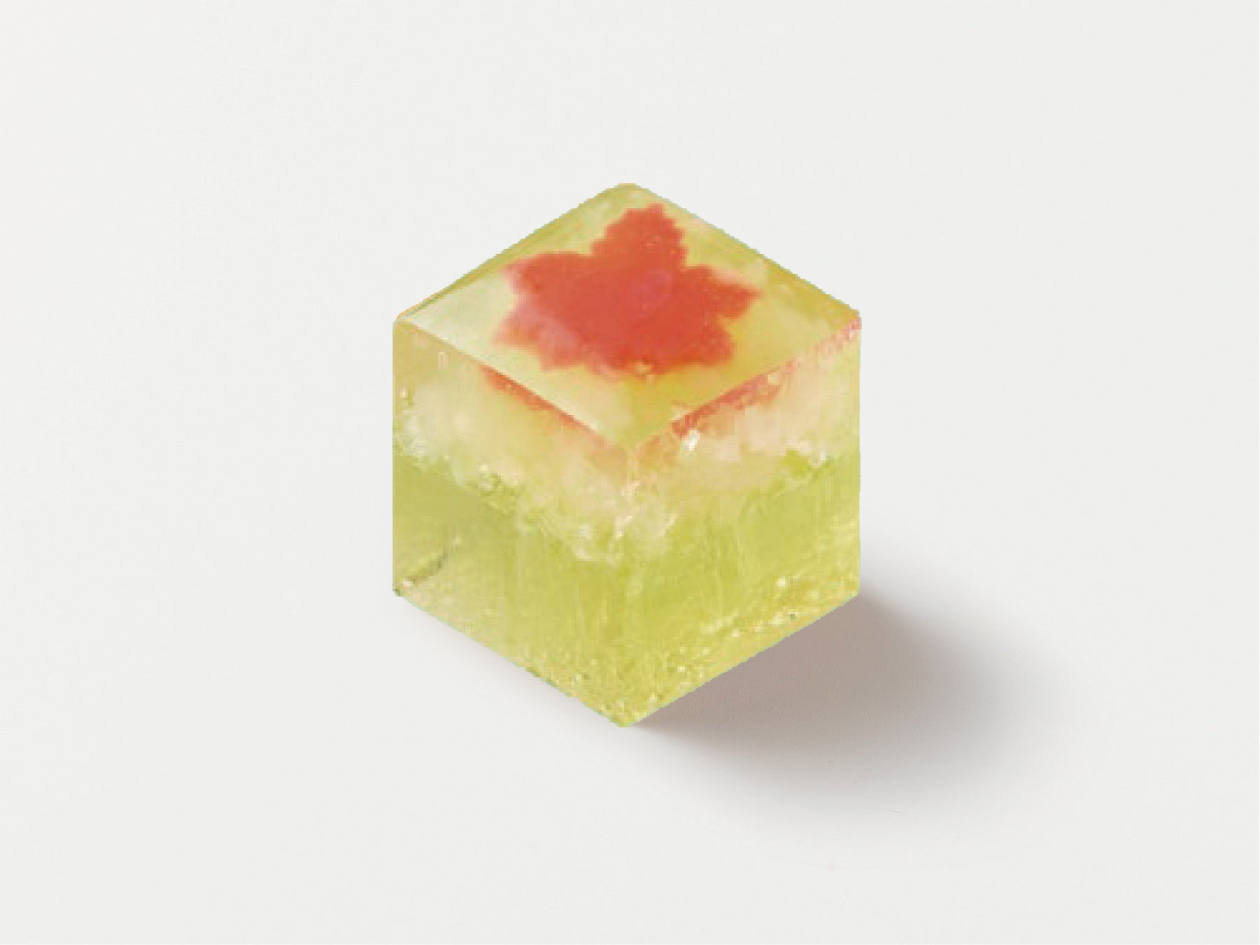 新緑色の錦玉羹と道明寺羹に赤い紅葉を浮かべて、箕面の大滝を表現しています。冷やすと一層美味しくお召し上がり頂けます。紅葉を色づけてリニューアルしました。
