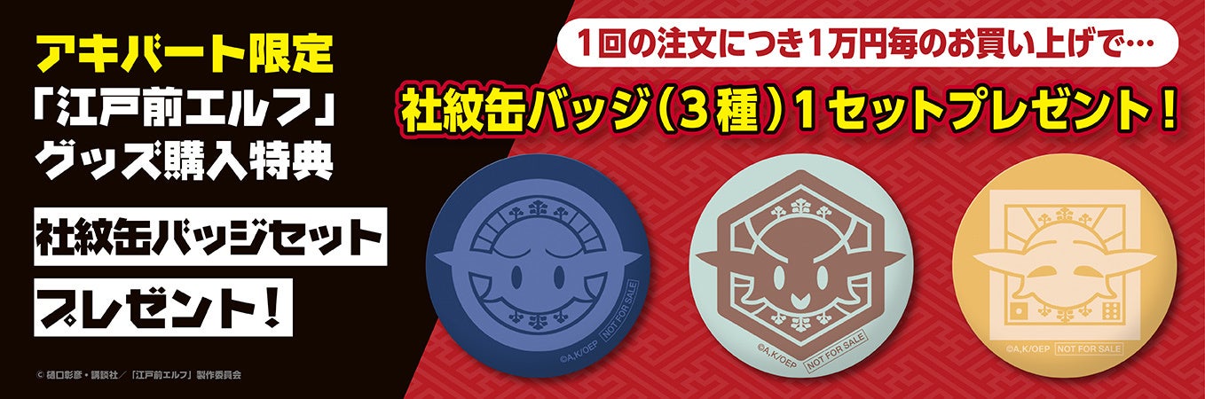 アキバート公式通販にて1回の注文につき1万円毎のお買い上げで、ここでしか手に入らない三社の社紋をデザインした『江戸前エルフ社紋缶バッジセット』をプレゼントいたします。