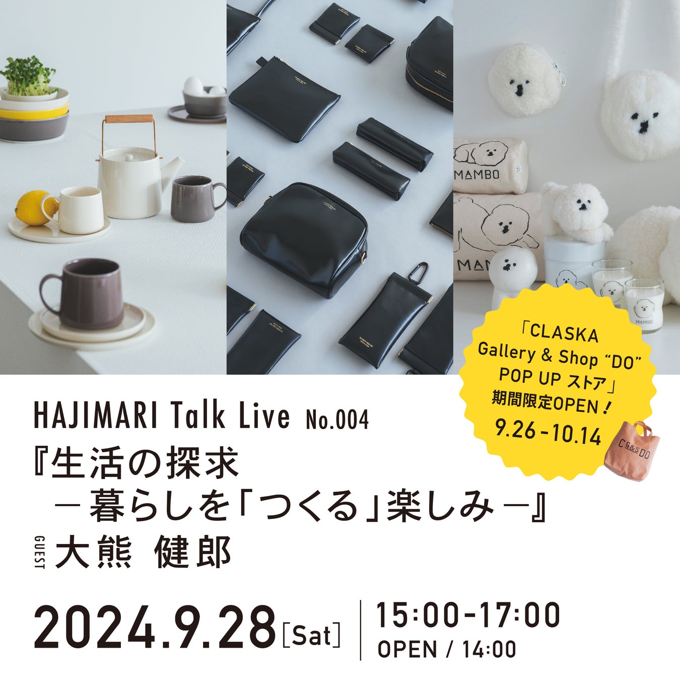 この度、別府市の宿泊できる複合⽂化拠点・HAJIMARI Beppuにて、【HAJIMARI Talk Live No.004 】を開催します。ゲストは、アーティストの⼤熊健郎⽒、タイトルは『⽣活の探求 ー暮らしを「つくる」楽しみー』です。