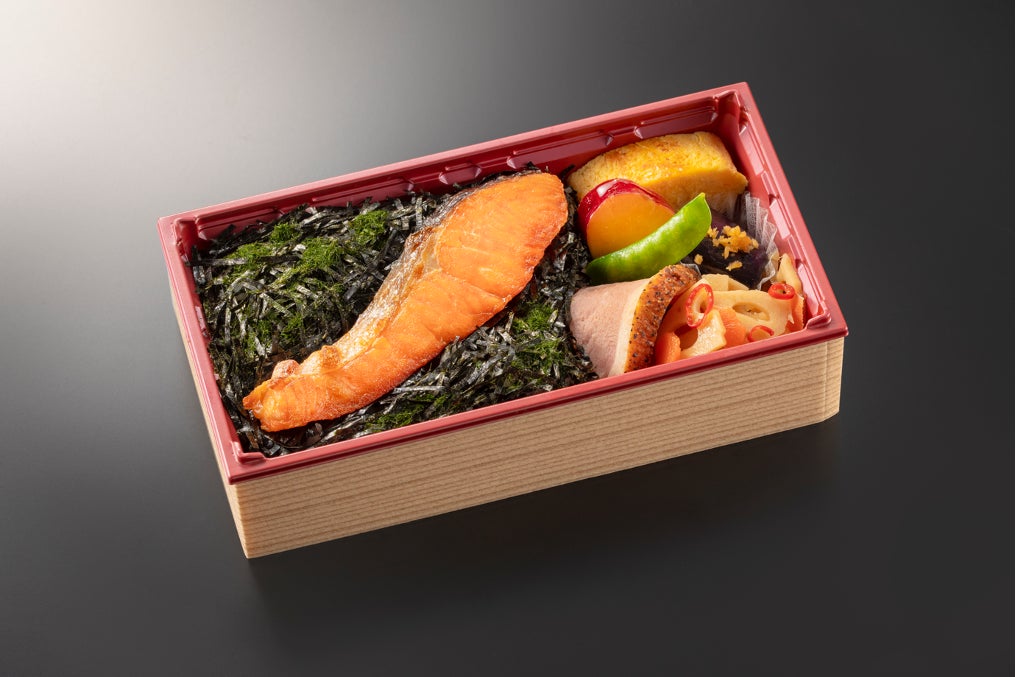 ご飯も、海苔の風味を生かす甘さと粘りのある新潟県産コシヒカリを使用し、炊飯から放冷まで、海苔が吸収する水分まで考慮した調整を行い、冷めた状態での最高の美味しさを追求。また、主菜の鮭から副菜に至るまで、全て、海苔ご飯との相性を考慮し、素材選びから味付けまで厳選。お弁当としての彩りの良さにもこだわりました。