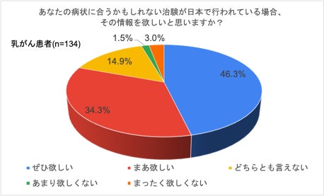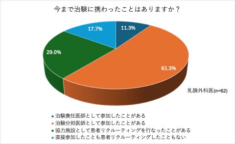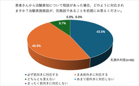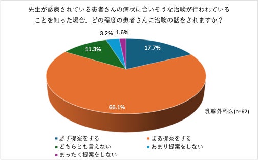 株式会社ケアネット(本社:東京都千代田区、代表取締役社長:藤井勝博、https://www.carenet.co.jp)と株式会社イシュラン(本社:東京都渋谷区、代表取締役:鈴木英介、https://www.ishuran.com/company)は、乳がんの患者さん(134名)と乳がん治療に携わる乳腺外科医(62名)を対象にした「治験に関する意識調査」を共同で実施しました。