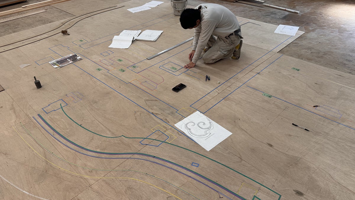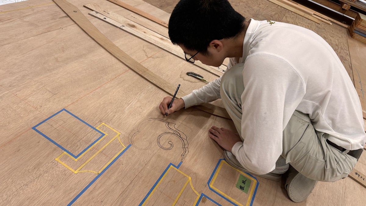 原寸図の段階では実際の建物の形が決まるため、設計図はあくまでもアタリ程度とし、最も重要な唐破風の曲線は何度も書き直し、「力強さと優美さ」を追及しました。原寸図と墨付けは、成長著しい当時30歳の山本(現副棟梁)に任せました。