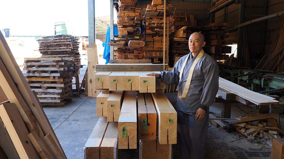 善應寺平唐門の化粧材には、奈良県産の吉野桧を採用しました。2022年秋に発注し、2023年2月の材料検査を経て、2024年4月に京都の匠弘堂工房に吉野桧材が搬入され、加工作業が開始されました。