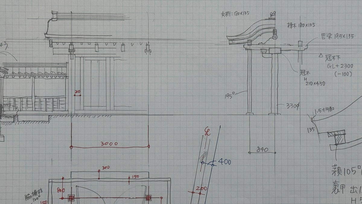 JR伊勢崎駅前の再開発に伴い、新しい道路に長く接道するという敷地条件から、唐破風を両側面に備える高貴な平唐門をご提案しました。設計は代表の横川が行い、彫刻から錺金物まですべてのデザインを手がけました。まずは手描きスケッチに始まり、最終の設計図では蟇股や木鼻などの彫刻に加え、御影石の四半敷き土間で、「力強さと優美さを兼ね備えた平唐門(ひらからもん)」をコンセプトに仕上げました。