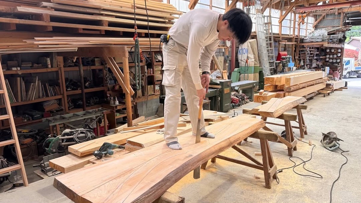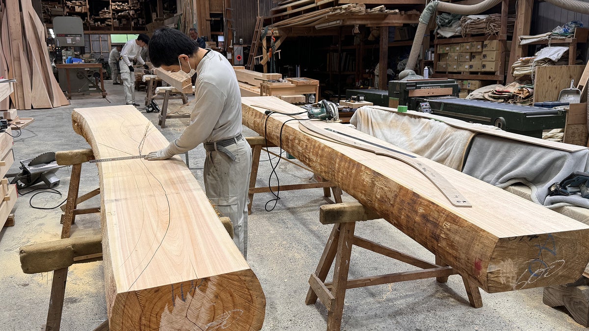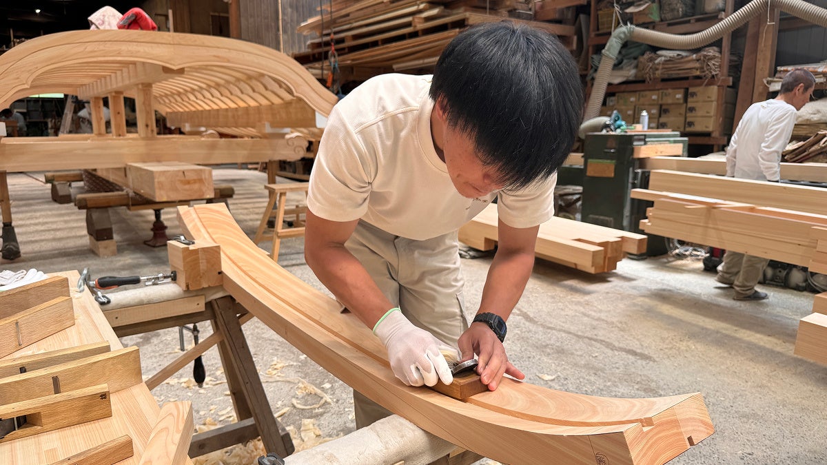 納材された吉野桧は、鋸(のこぎり)鑿(のみ)や鉋(かんな)を駆使し、四角い木材からなめらかな曲線を削り出して、各部材の大きさに成形されていきました。