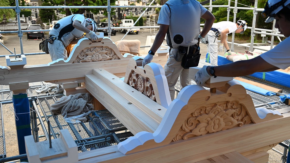 仮組を解体した後、部材を群馬県伊勢崎市の善應寺境内に搬送し、現地での建て方(組み立て)を実施しました。宮大工による建て方が終わると、屋根葺き、左官壁塗り、石工事と進み、最後に建具と錺金物を取り付けます。玉垣は地元の中村石材店が施工を担当し、山門・木塀と玉垣が一体となった景観が完成いたしました。