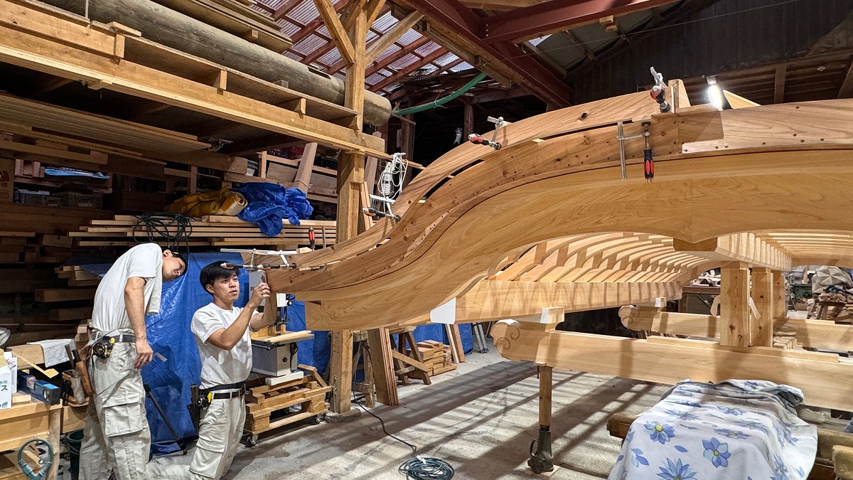 社寺建築では、現場での建て方の前に事前に仮組作業をすることで、各部材の取り合い箇所の調整を行います。工房では現副棟梁の山本と若手の義久を中心に、微妙に曲がった屋根の軒反りを構成する部材を、細心の注意を払って組んでいきました。仮組が進むにつれ、工房の空気感が一気に変わり、全員のモチベーションが上がりました。