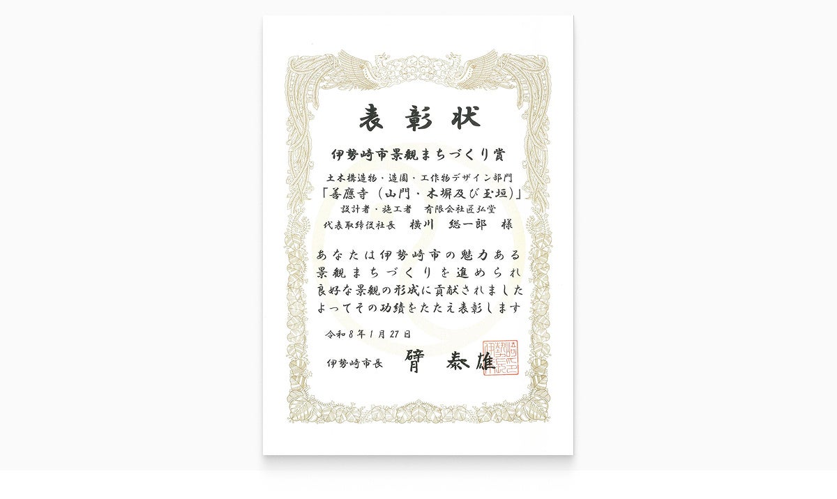 有限会社匠弘堂(本社:京都市左京区/代表取締役:横川総一郎)は、群馬県伊勢崎市・善應寺(住職:小川晃龍様)より設計施工を受託した新築山門・木塀が、「令和7年度 伊勢崎市景観まちづくり賞」の「土木構造物・造園・工作物デザイン部門」に選定されたことをお知らせいたします。玉垣の設計施工を担当された中村石材店(伊勢崎市)と共に、匠弘堂も表彰を受けました。