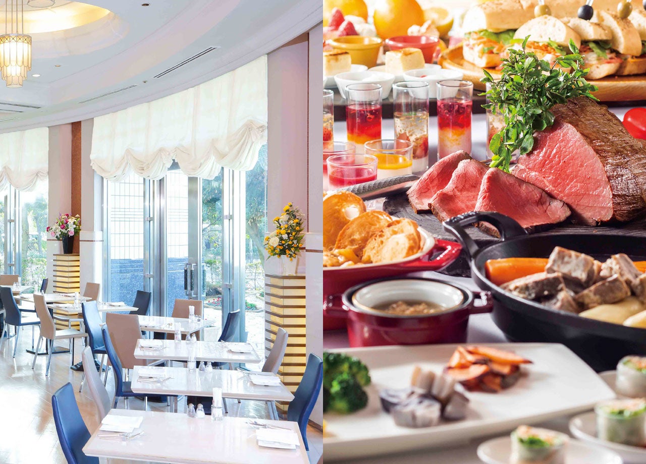 ライブキッチンでは、低温でじっくりと火入れをする事でしっとり柔らかく仕上げた「ローストビーフ」を、お客さまの目の前で切り分けて提供いたします。ディナータイムにはもう一つの名物料理である香り高い「ブイヤベース」もシェフがお取り分けいたしますので、ホテルならではの贅沢なサービスと美味しさを堪能いただけます。また、ランチ・ディナーとも「シーフードパエリア」はテーブルまでお届けいたします。「お野菜の自家製マリネ」、「チャバッタブレッドのサンドウィッチ」など、バラエティーに富んだラインナップがスイーツとともにブッフェコーナーに登場いたします。