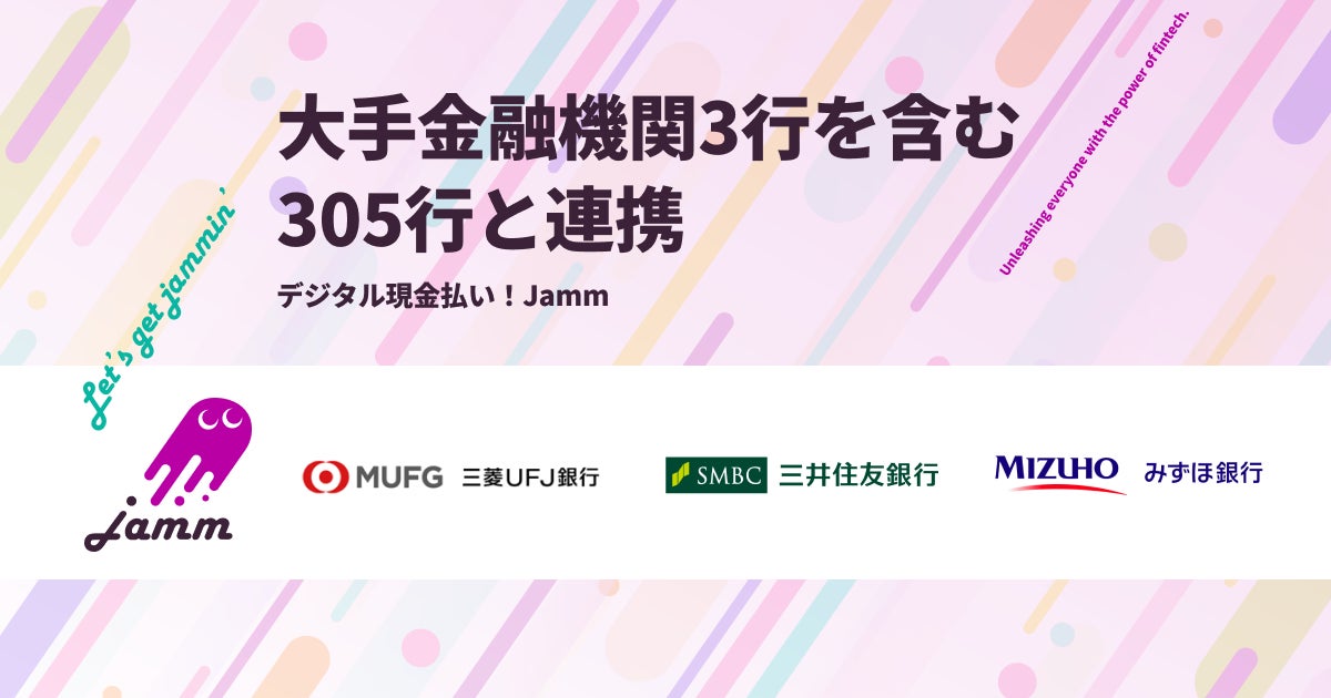 「デジタル現金払い!Jamm」大手金融機関3⾏を含む305行と連携