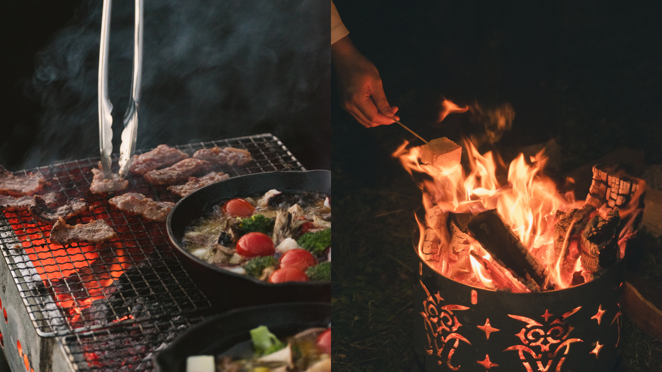 サウナを十分に楽しんだ後は、キャンプ場で火を起こして、サウナ飯を味わう。