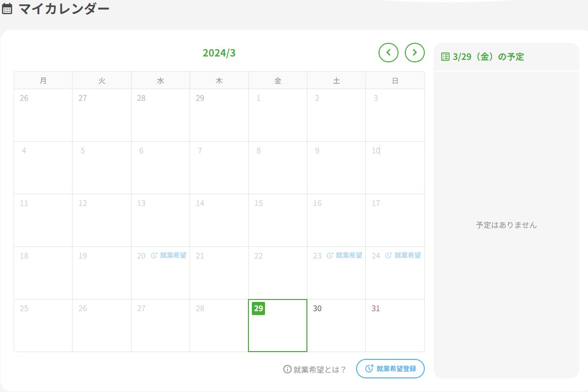 ユーザーが空いた日に短期間で働ける機会を最大限に利用するために、直感的に操作可能なマイカレンダー機能を導入しました。この新機能により、カレンダー上で直接自分の働ける日を入力し、一目で仕事の予定を確認できるようになります。