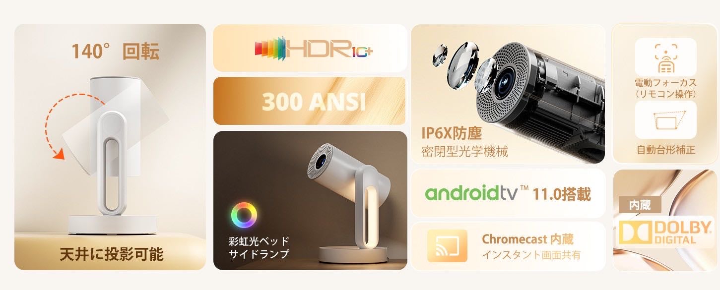 ETOEは近年、消費者の使用シーンとプロジェクターの特性に対する徹底的な研究を通じて、全く新しいプロジェクター「ETOE Starfish」を発表しました。この製品はベッドルーム専用に設計されており、初めてプロジェクターとカラフルなナイトライトを融合させたものです。140度回転可能な単腕回転支柱設計を採用し、天井プロジェクションモードへの簡単な切り替えを可能にしています。内蔵の4K Android TV 11.0システムにより、ベッドの上で大画面エンターテイメントを自由に楽しむことができます。